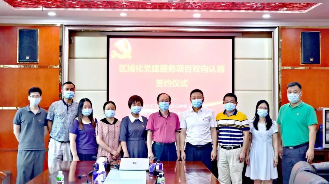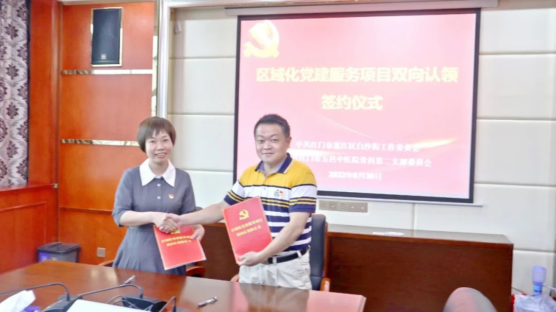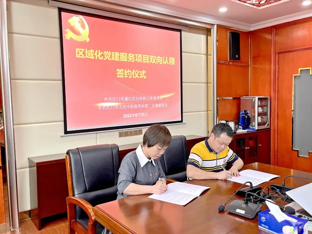 为充分发挥资源共享的党建的优势,促进基层党建工作高质量发展,6月30日,市五邑中医院党委委员、副院长陈述祥率骨科党建片区党员干部到江门市蓬江区白沙街道办事处举行区域化党建服务项目双向认领签约仪式。