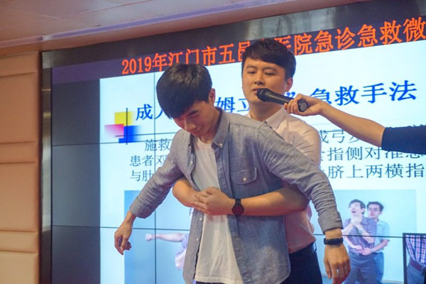 许雄护士边演示边讲解,生动的展示了呼吸道异物梗阻时“海姆立克”急救法。