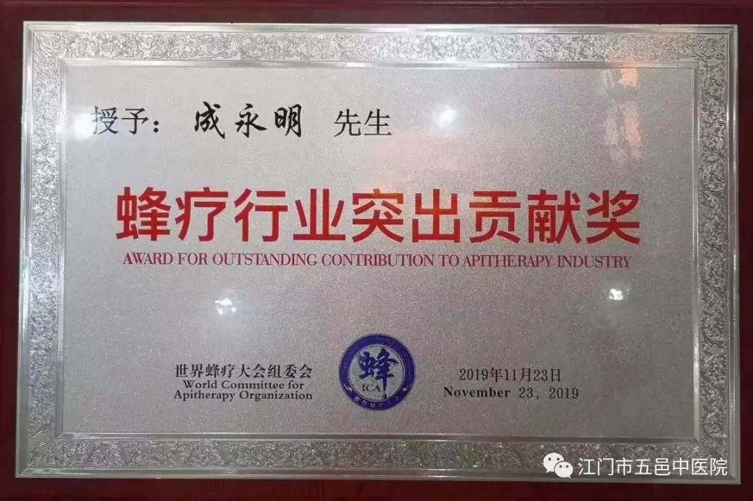 ▲第二届世界蜂疗大会上,成永明主任获“蜂疗行业突出贡献奖”。
