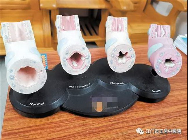 ▲哮喘严重程度的气管情况:从左到右分别为正常气管、轻症哮喘气管、中症哮喘气管、重症哮喘气管,气管痉挛越来越严重。
