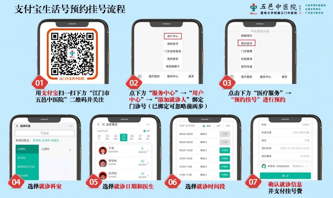 支付宝预约挂号流程:关注支付宝生活号“江门市五邑中医院”→用户中心→输入就诊人电话号码→获取验证码→医疗服务→预约挂号→选择科室→选择医生→选择时间和日期→诊疗收费→挂号成功。