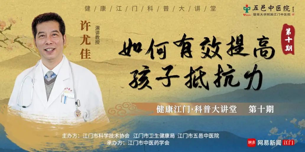 由江门市科学技术协会、江门市卫生健康局、江门市中医药学会、江门市五邑中医院联合举办的“健康江门 • 科普大讲堂”。第十期邀请到了广州中医药大学第二临床医学院儿科教研室主任、广东省中医院儿科主任,许尤佳主任教授亲临现场讲授《如何有效提高孩子抵抗力》。