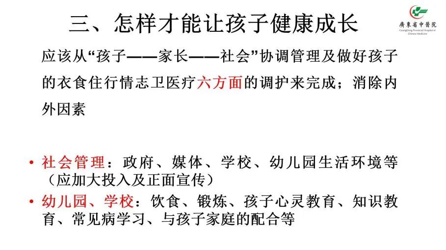 在后天养育上,家长要从衣食住行、情志、医疗六个方面进行合理调护,学习与孩子相关的医学知识。在日常生活中,应学会和孩子沟通,最好做到“遇物则教之”。同时也要培养“治未病”的观念,让小病不发。在现场,许教授还传授了许多判断儿童脾胃是否失和的小方法。