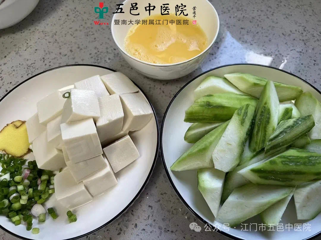 材料:丝瓜1条,豆腐200克,鸡蛋2个,生姜2片,葱1根(可供3至5人食用)