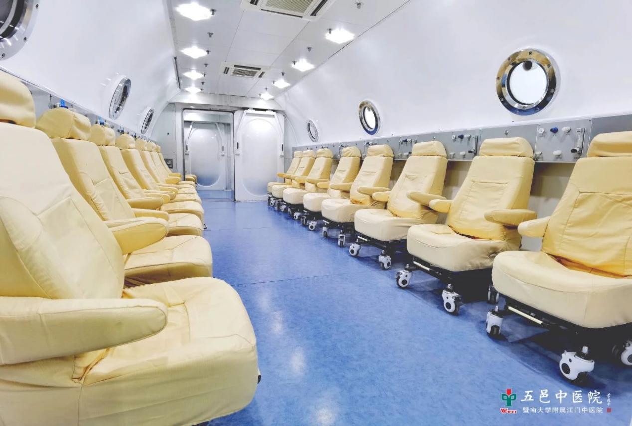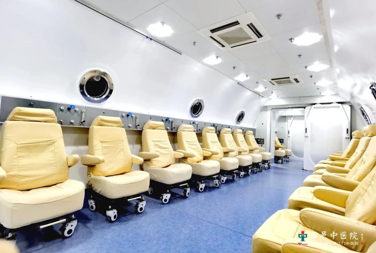 江门市五邑中医院高压氧治疗中心位于本部露天停车场东北侧,于2023年底改建成功并投入使用,一进入治疗中心,科技感满满的高压氧舱呈现在眼前,椭圆形外立面,如飞机舱般的室内设施,数字化集成化操作十分先进。