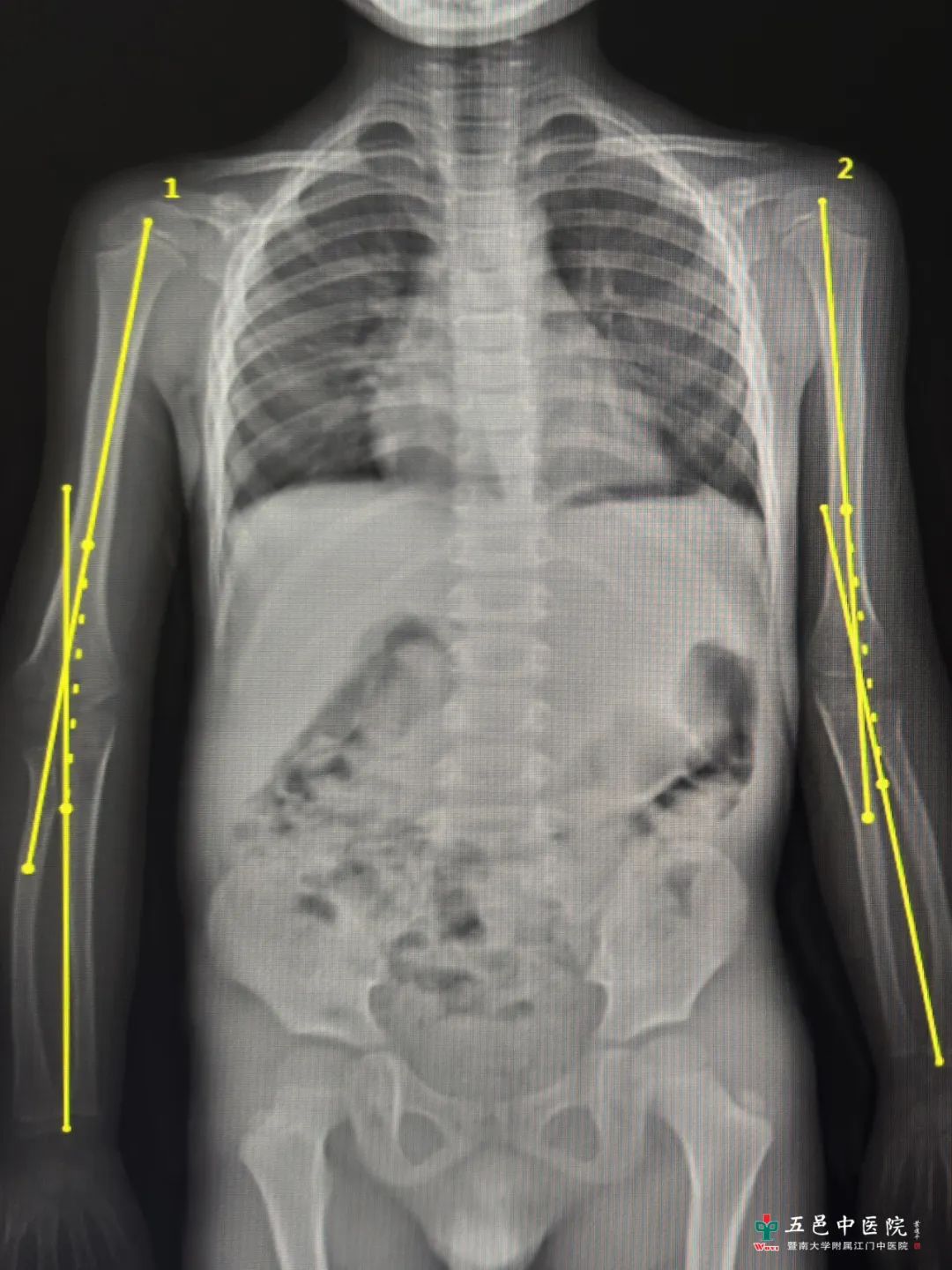 最终,孩子的手臂会呈现“枪托样”畸形(手臂伸直时向内弯曲,类似枪托形状),医学上称为肘内翻(提携角小于正常值,甚至为负值)。
