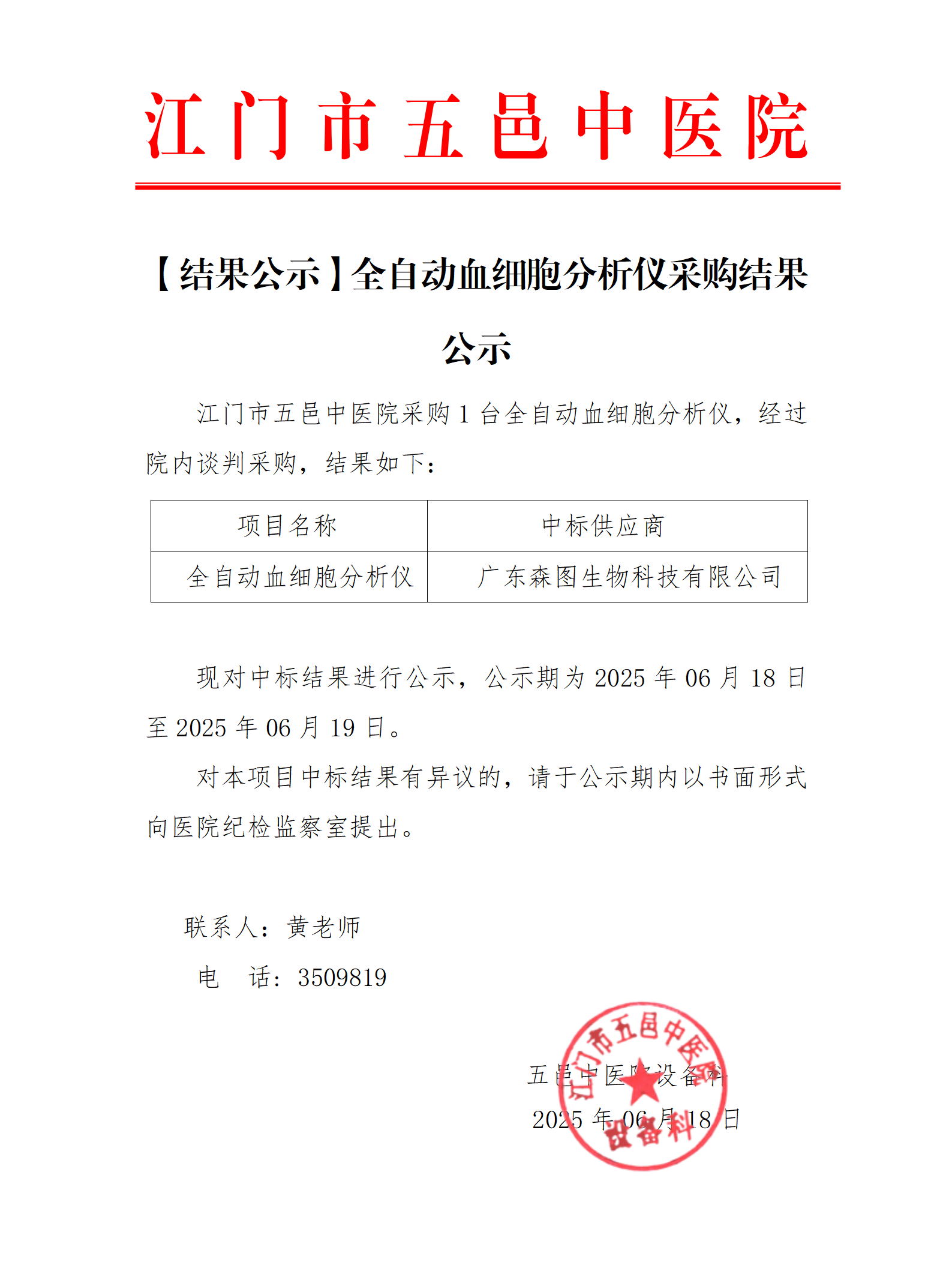 医疗设备采购结果公示-全自动血细胞分析仪