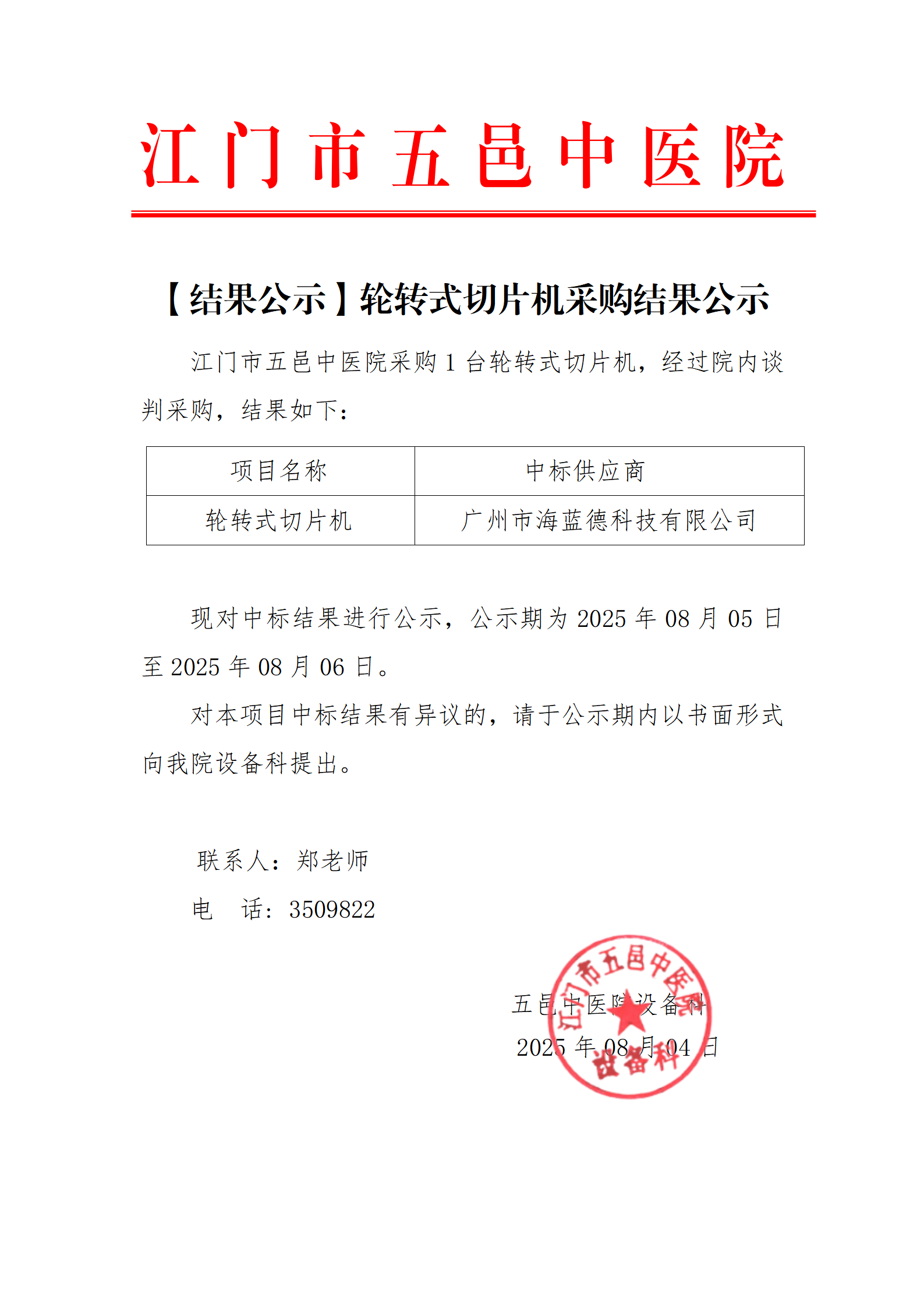 医疗设备采购结果公示-轮转式切片机