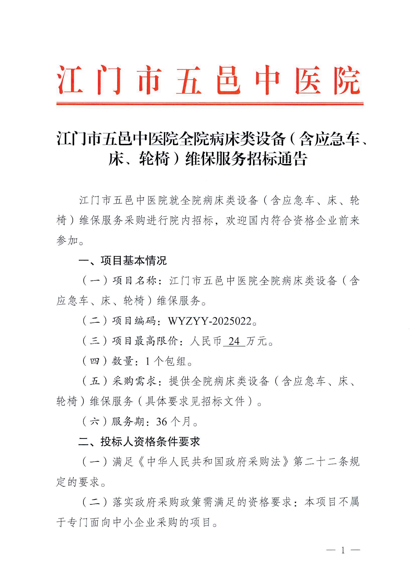 江门市五邑中医院全院病床类设备(含应急车、床、轮椅)维保服务招标通告