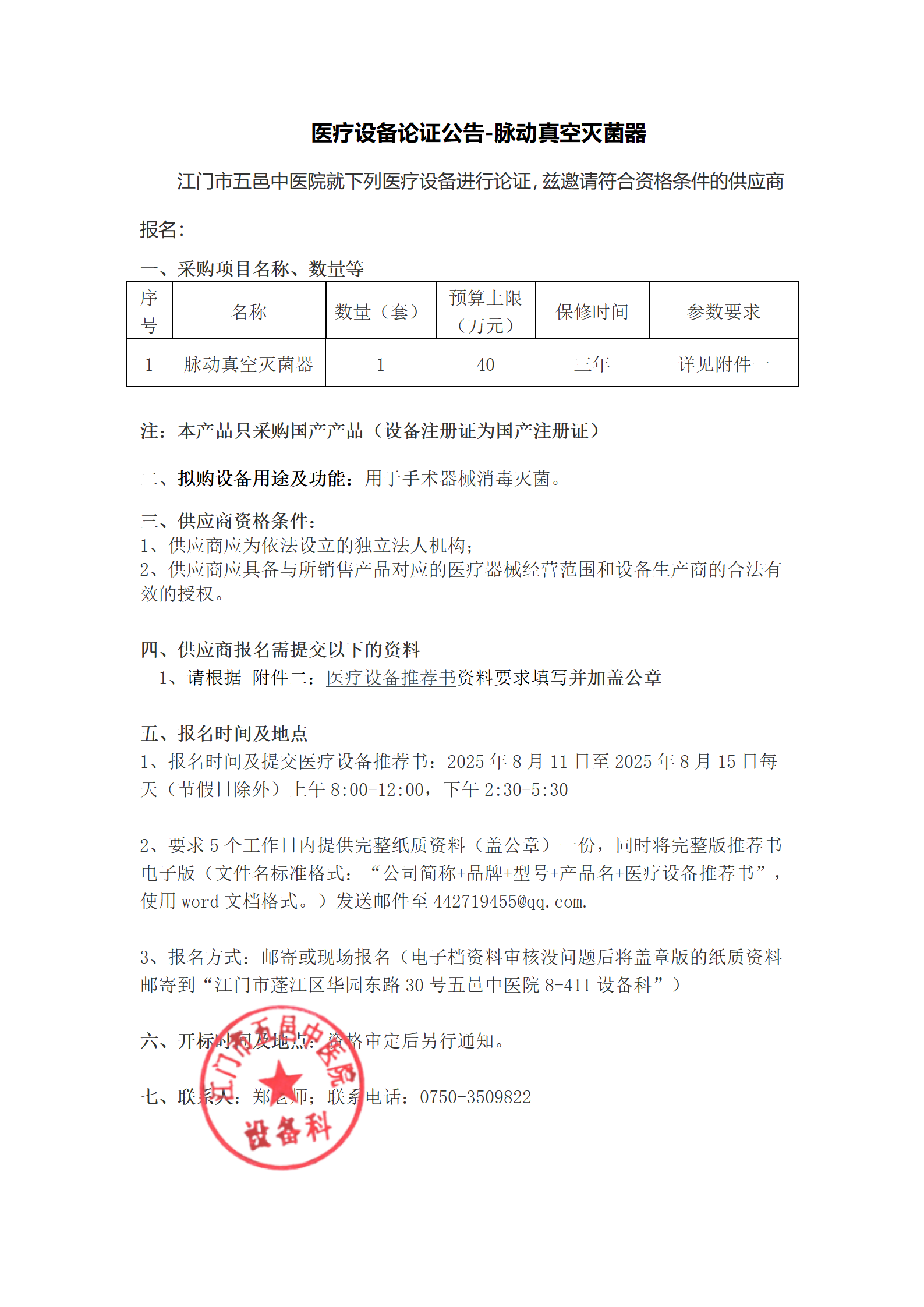 医疗设备论证公告-脉动真空灭菌器