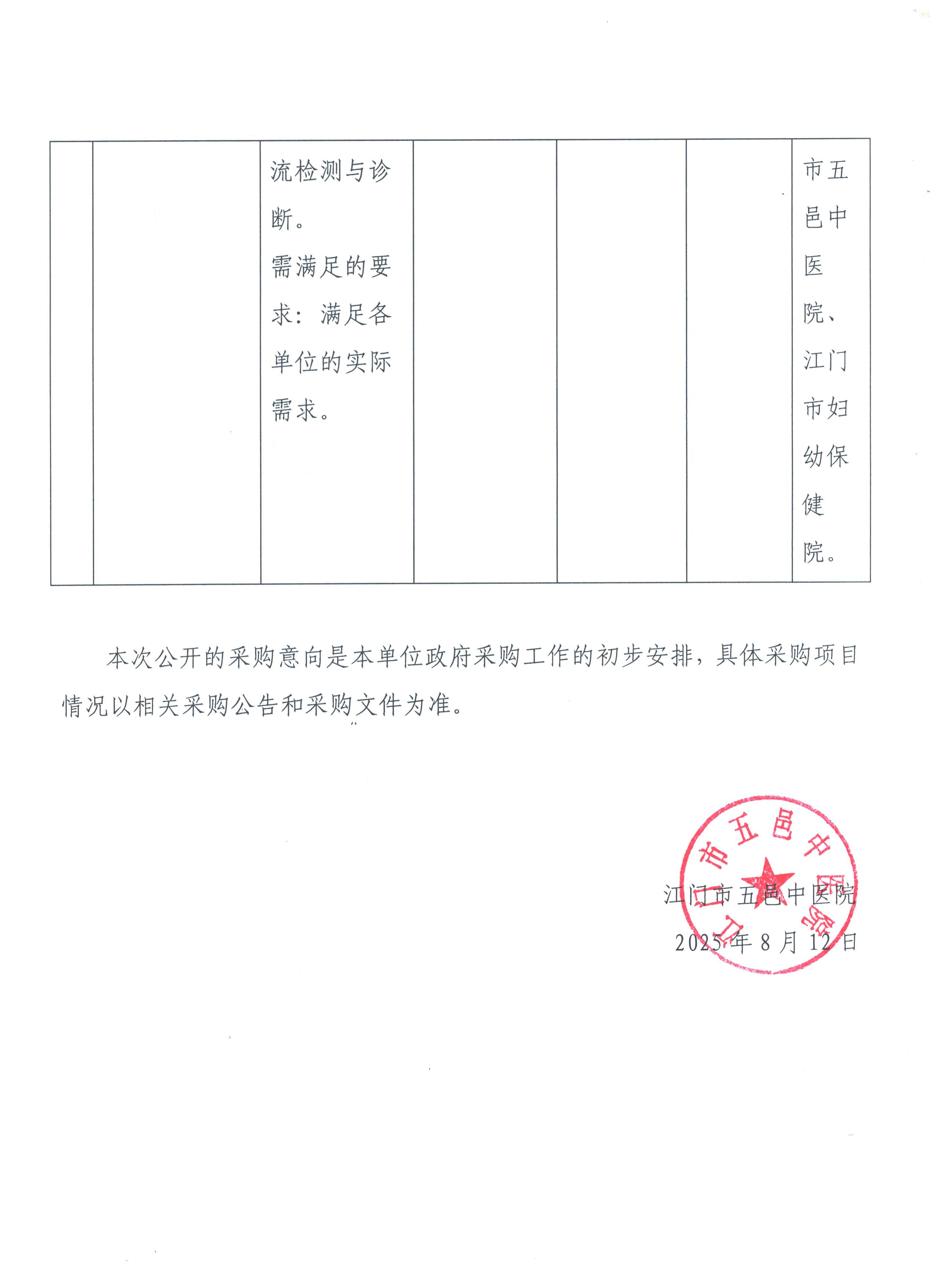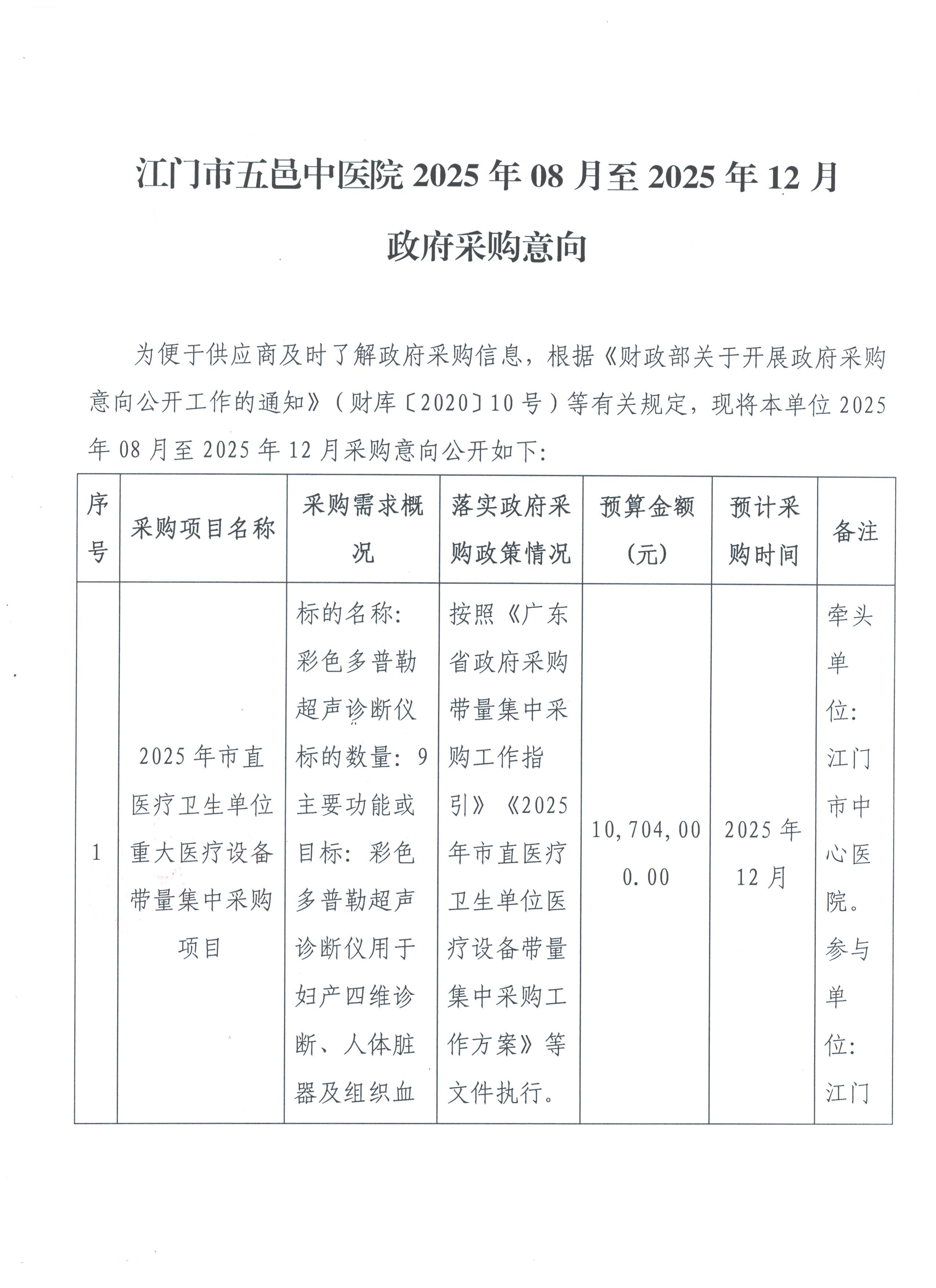 江门市五邑中医院2025年08月至2025年12月政府采购意向