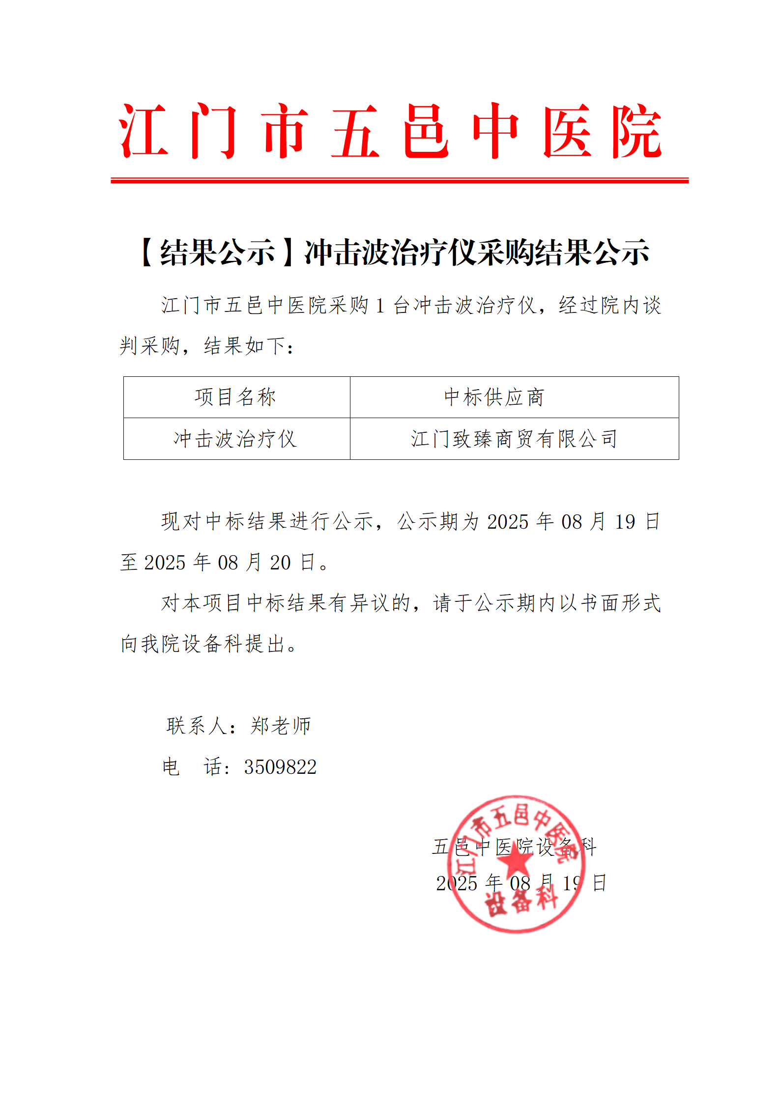 医疗设备采购结果公示-冲击波治疗仪