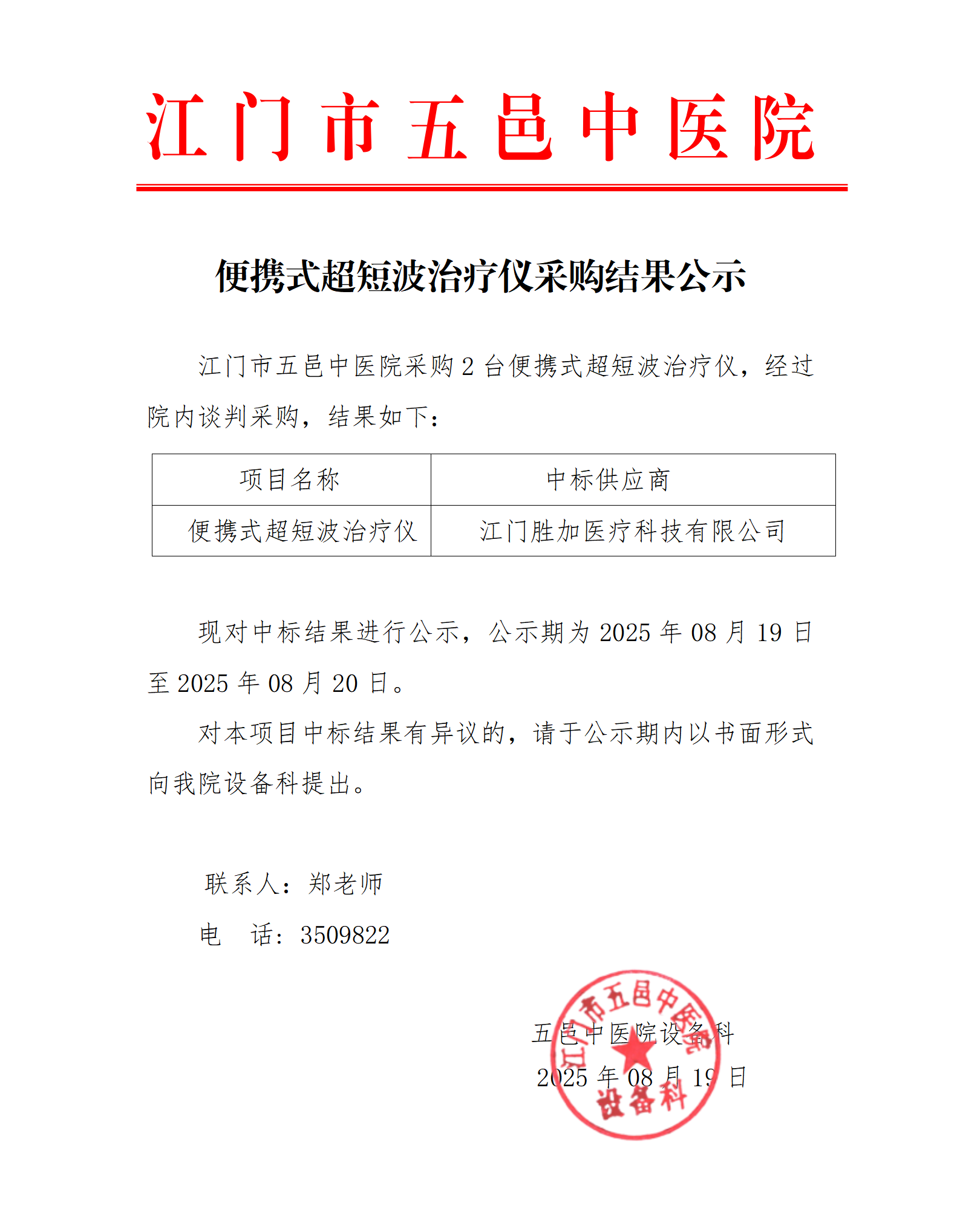 医疗设备采购结果公示-便携式超短波治疗仪