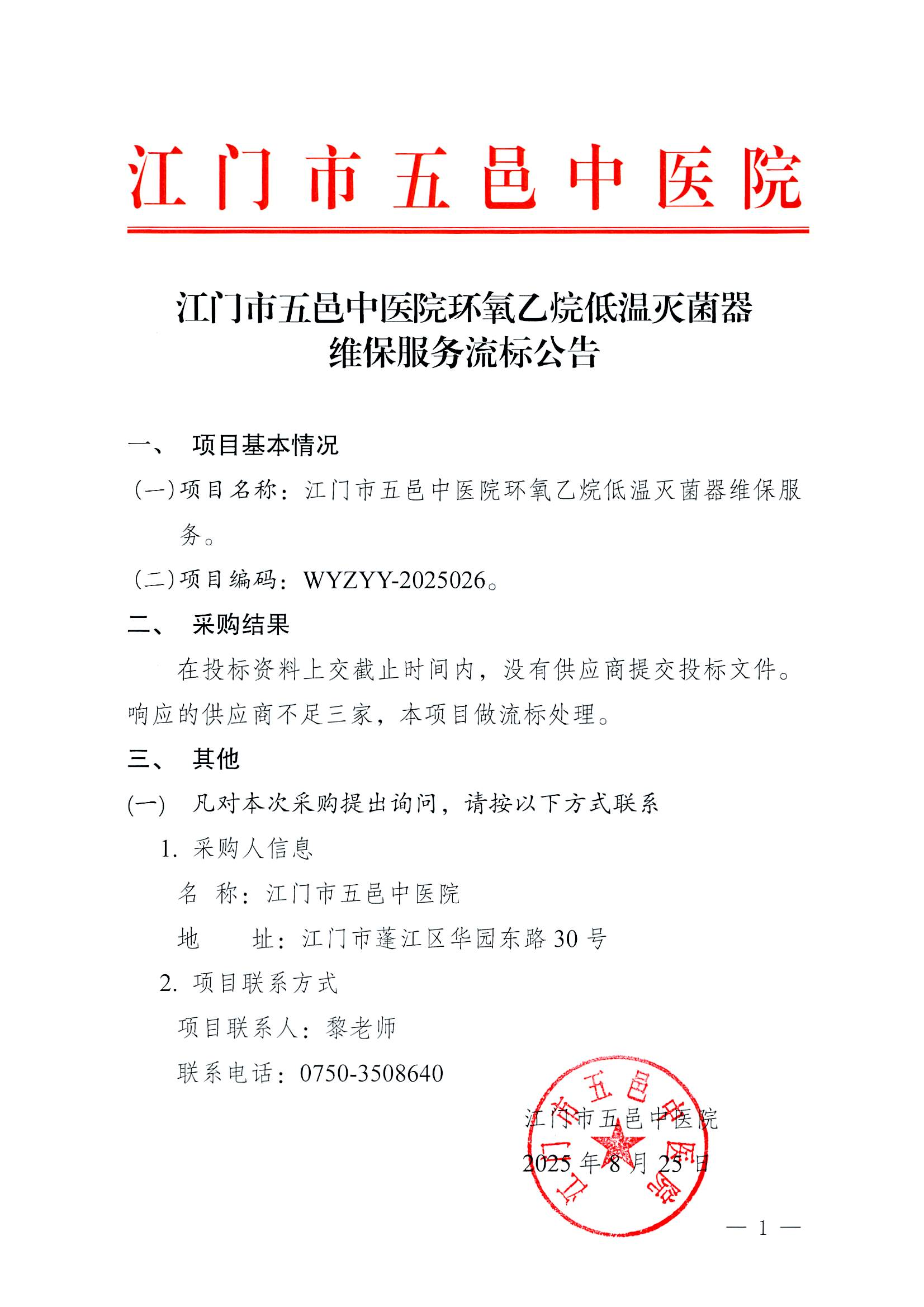 江门市五邑中医院环氧乙烷低温灭菌器维保服务流标公告