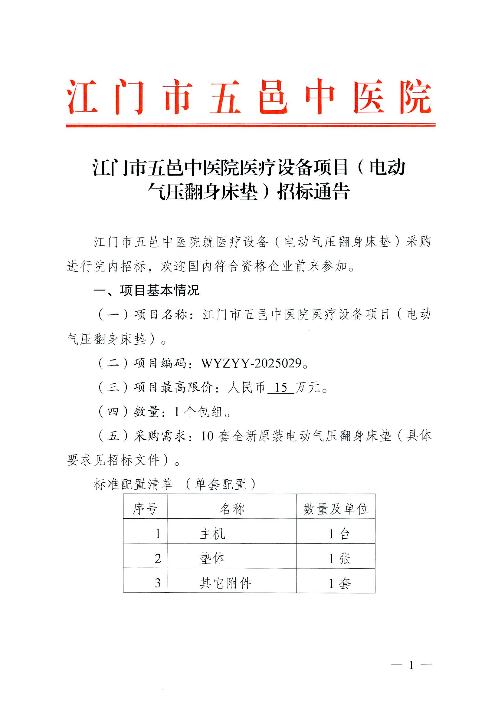 江门市五邑中医院医疗设备项目(电动气压翻身床垫)招标通告