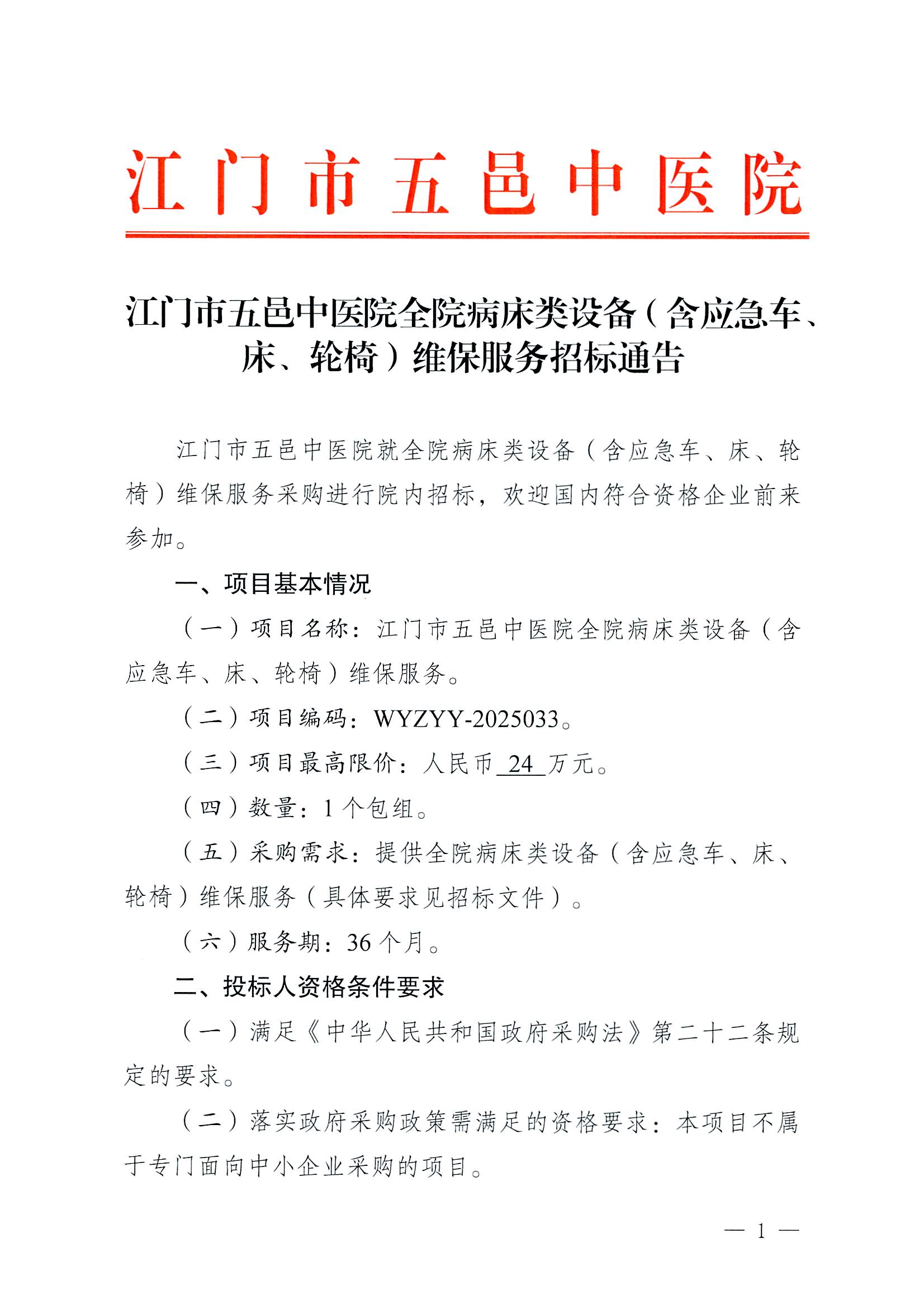 江门市五邑中医院全院病床类设备(含应急车、床、轮椅)维保服务招标通告