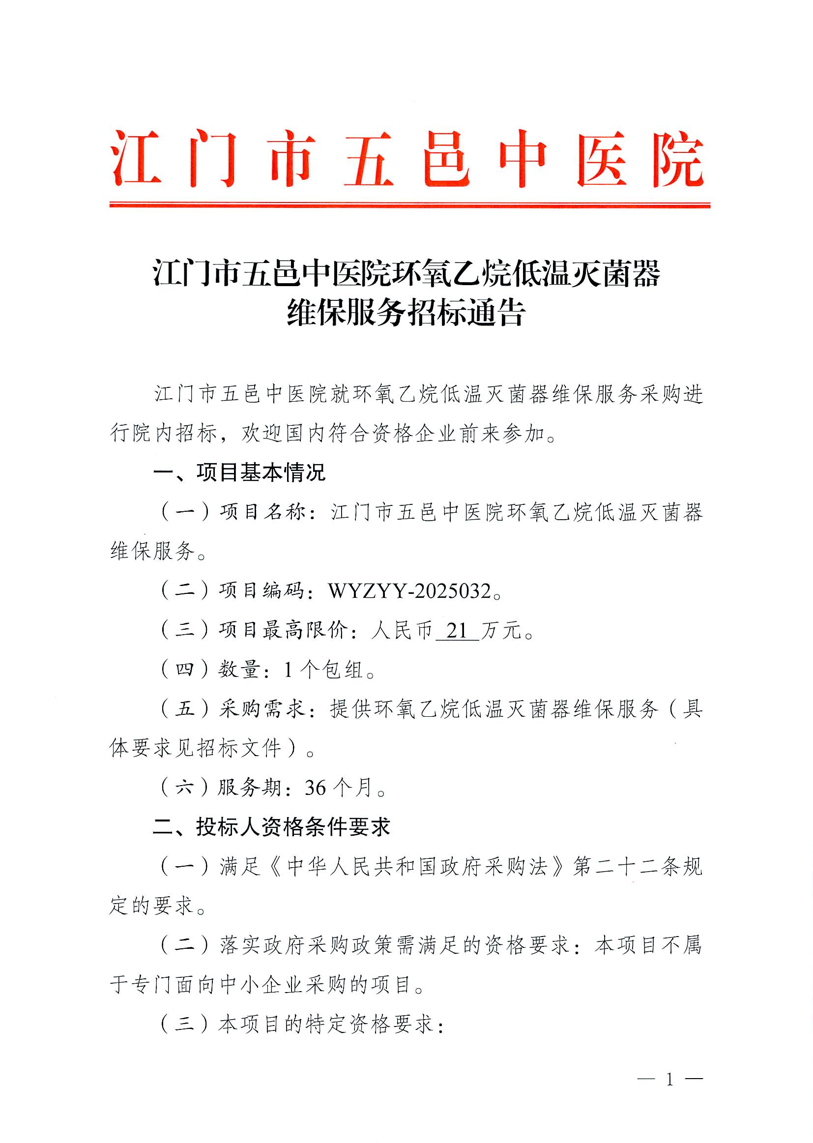 江门市五邑中医院环氧乙烷低温灭菌器维保服务招标通告