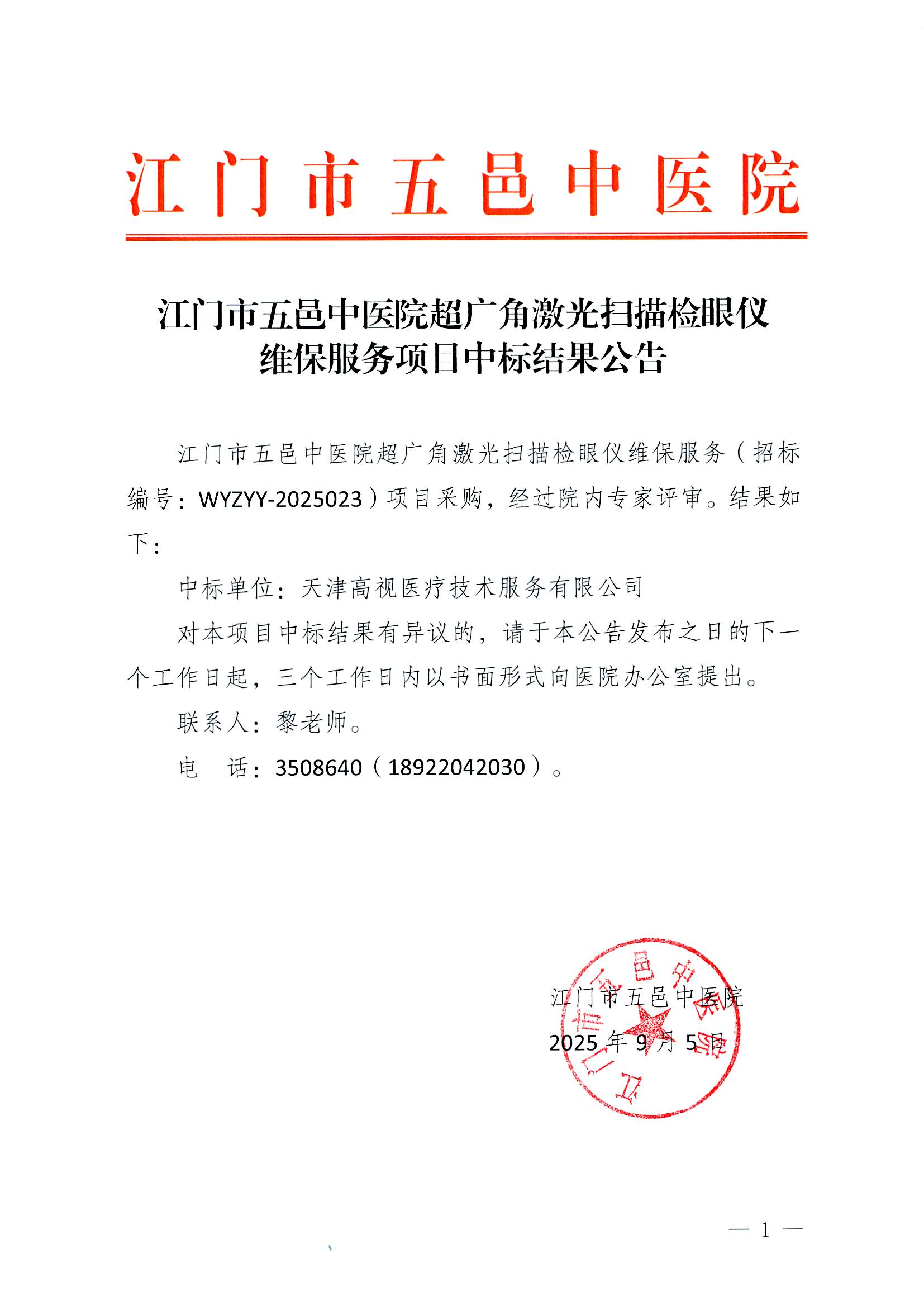 江门市五邑中医院超广角激光扫描检眼仪维保服务项目中标结果公告