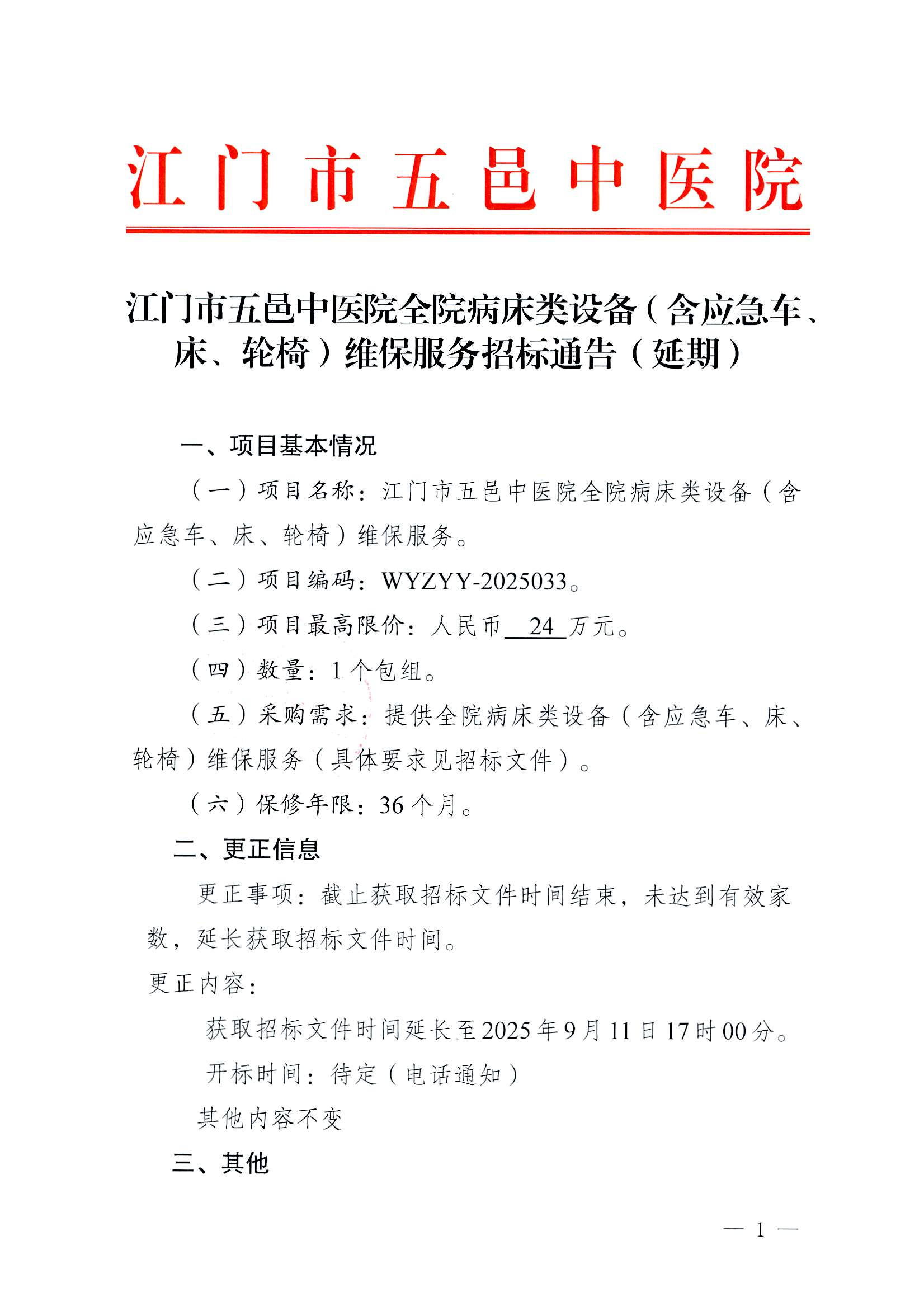 江门市五邑中医院全院病床类设备(含应急车、床、轮椅)维保服务招标通告(延期)