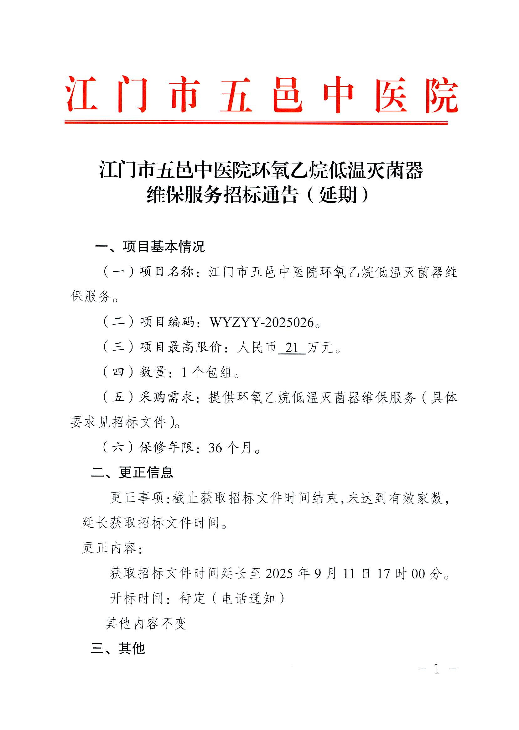 江门市五邑中医院环氧乙烷低温灭菌器维保服务招标通告(延期)