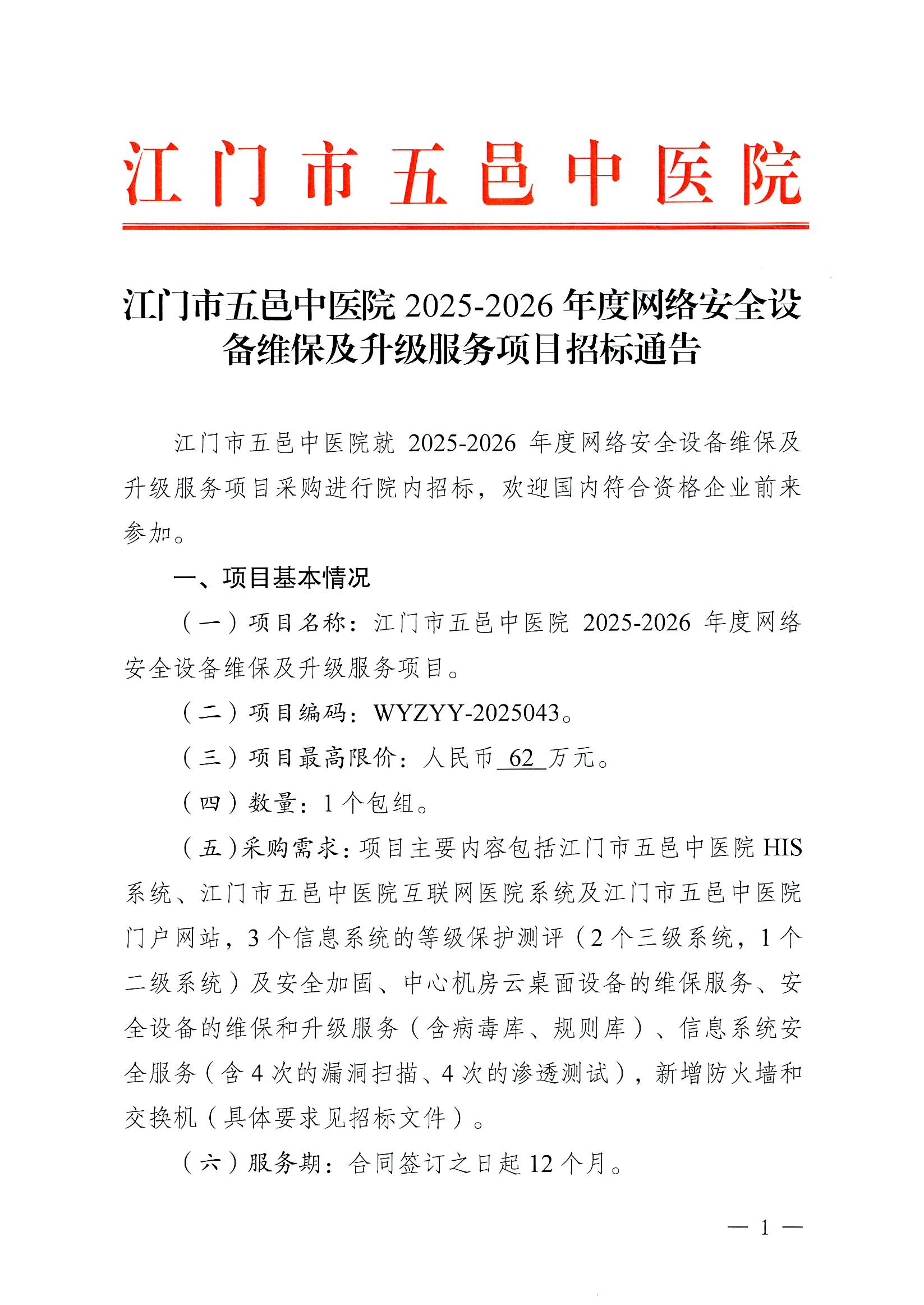 江门市五邑中医院2025-2026年度网络安全设备维保及升级服务项目招标通告