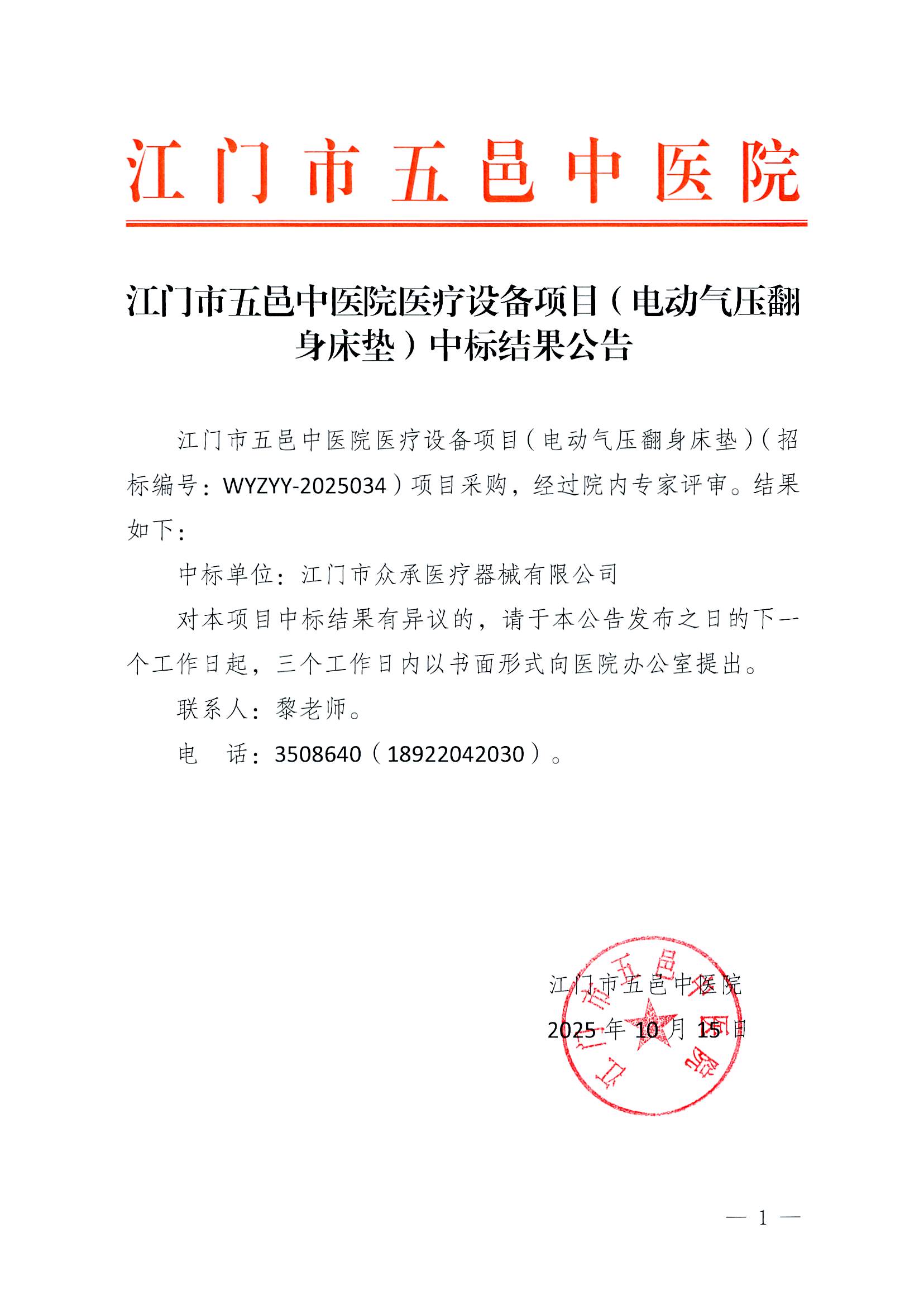 江门市五邑中医院医疗设备项目(电动气压翻身床垫)中标结果公告