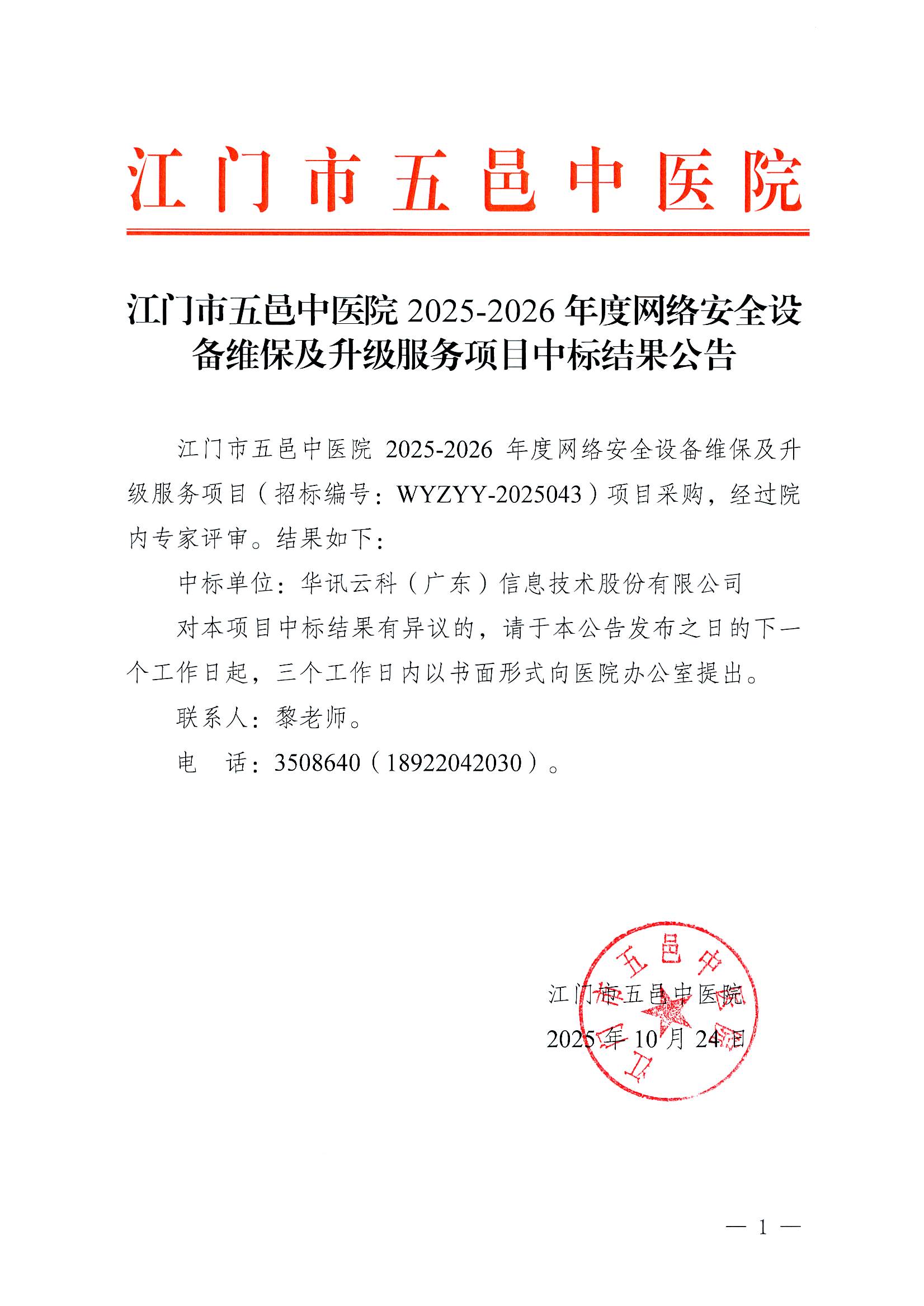 江门市五邑中医院2025-2026年度网络安全设备维保及升级服务项目中标结果公告