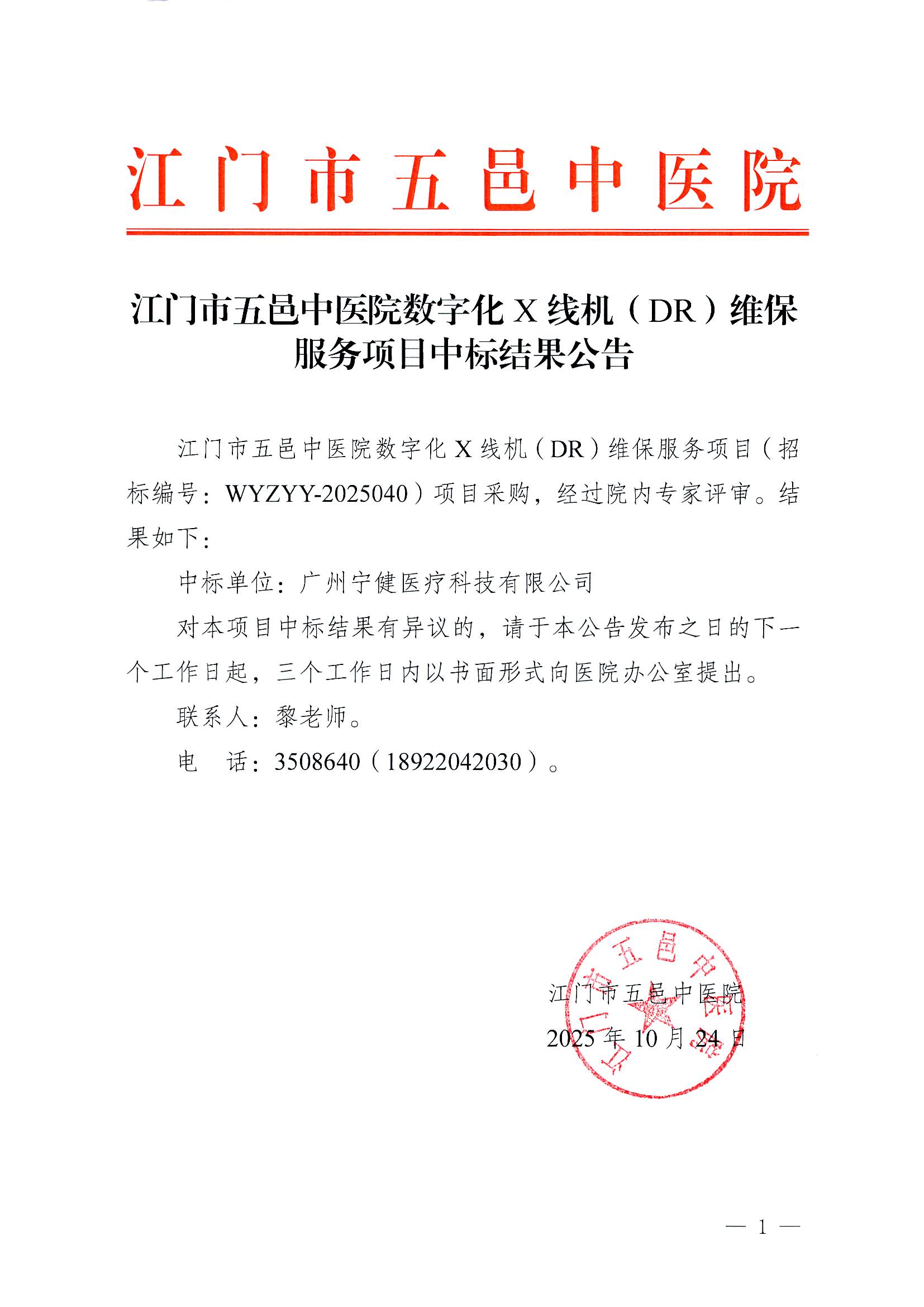 江门市五邑中医院数字化X线机(DR)维保服务项目中标结果公告