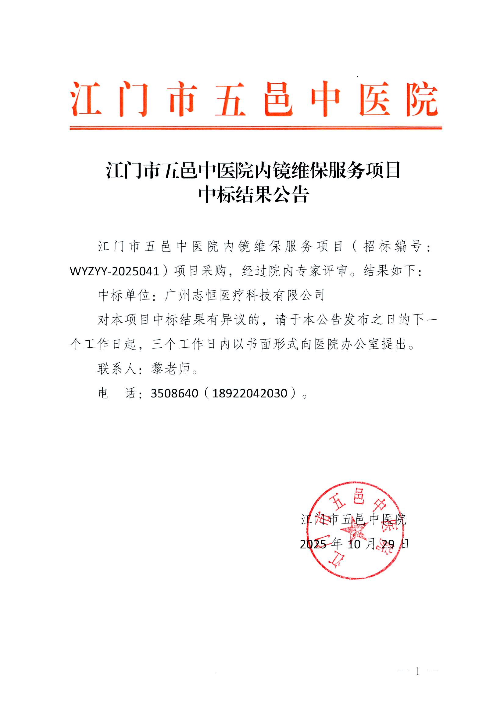 江门市五邑中医院内镜维保服务项目中标结果公告