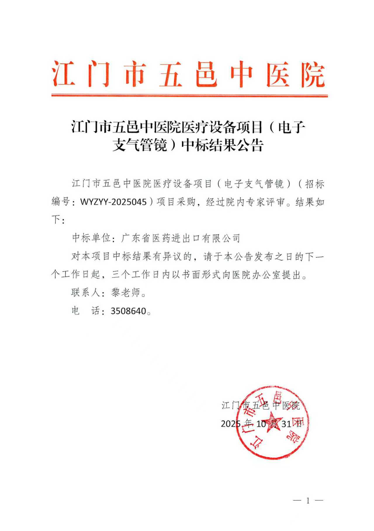 江门市五邑中医院医疗设备项目(电子支气管镜)中标结果公告