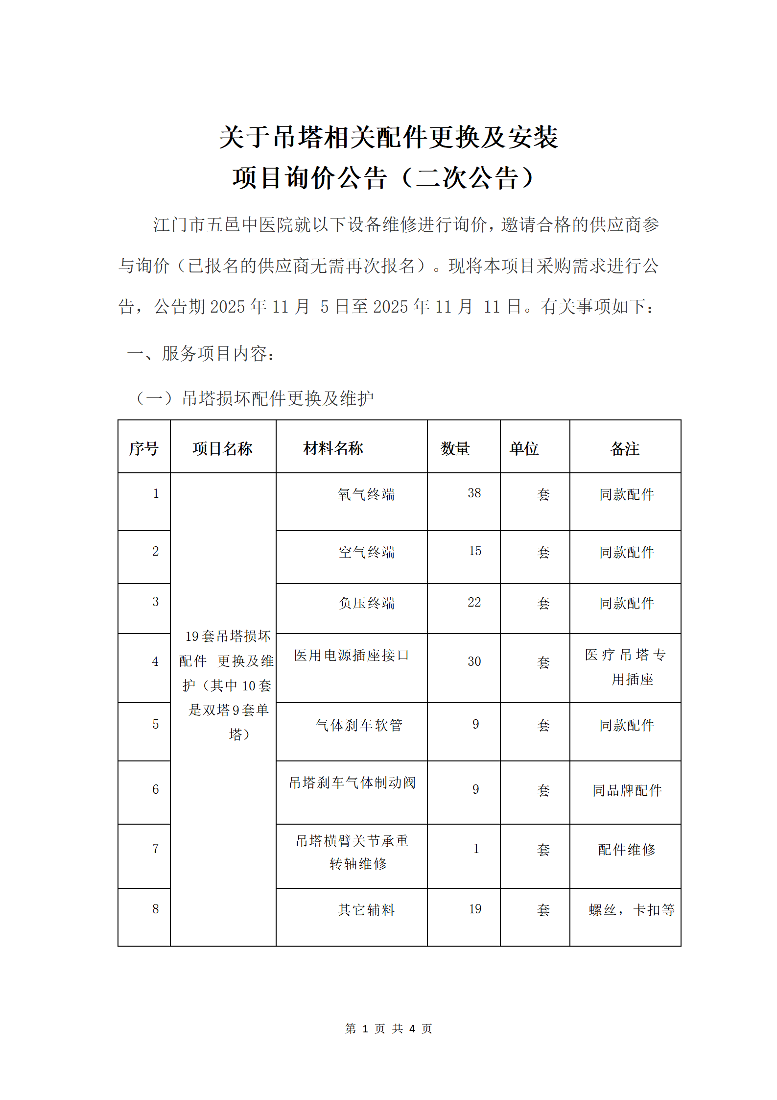 关于吊塔相关配件更换及安装项目询价公告 (二次公告)