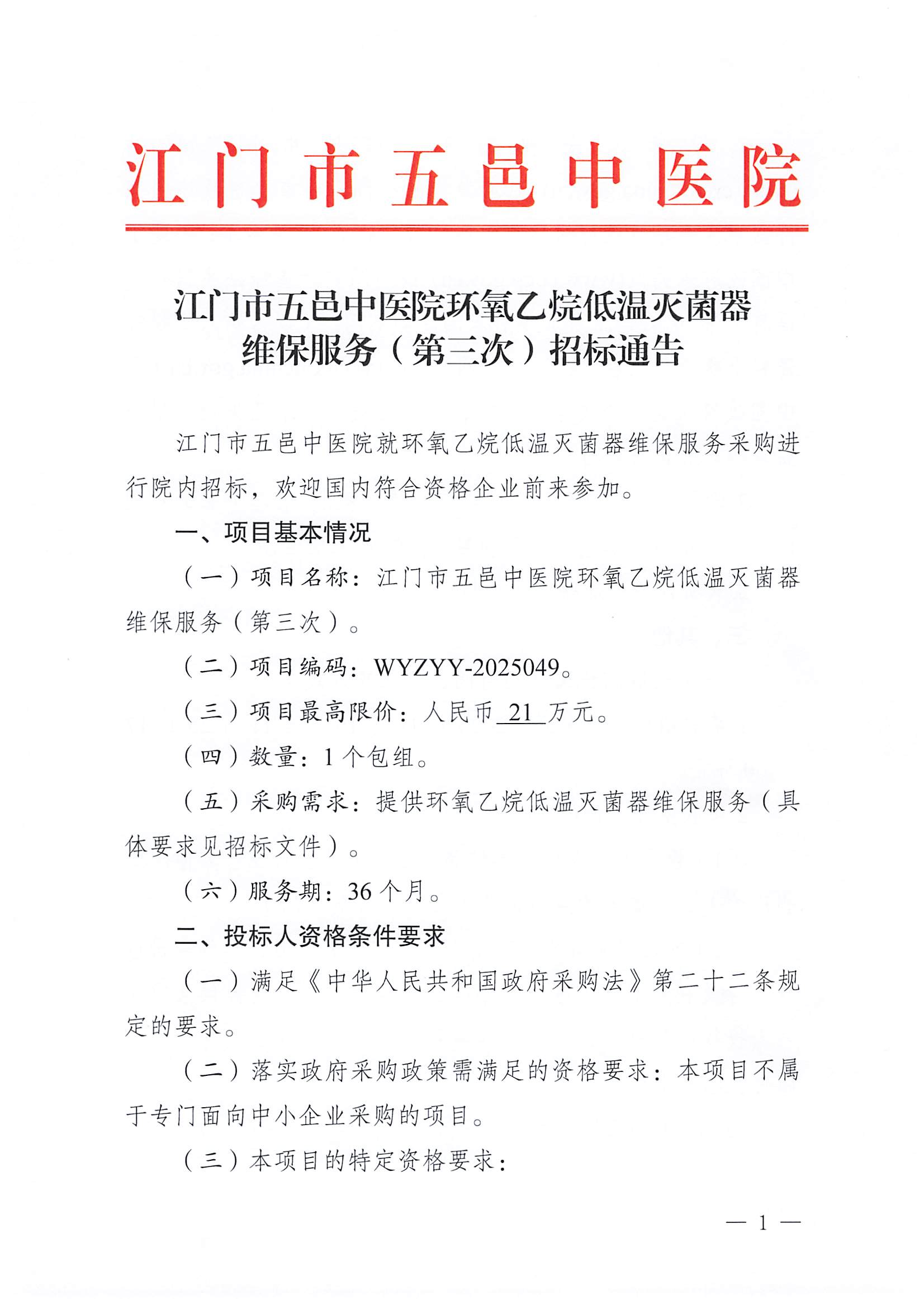 江门市五邑中医院环氧乙烷低温灭菌器维保服务(第三次)招标通告