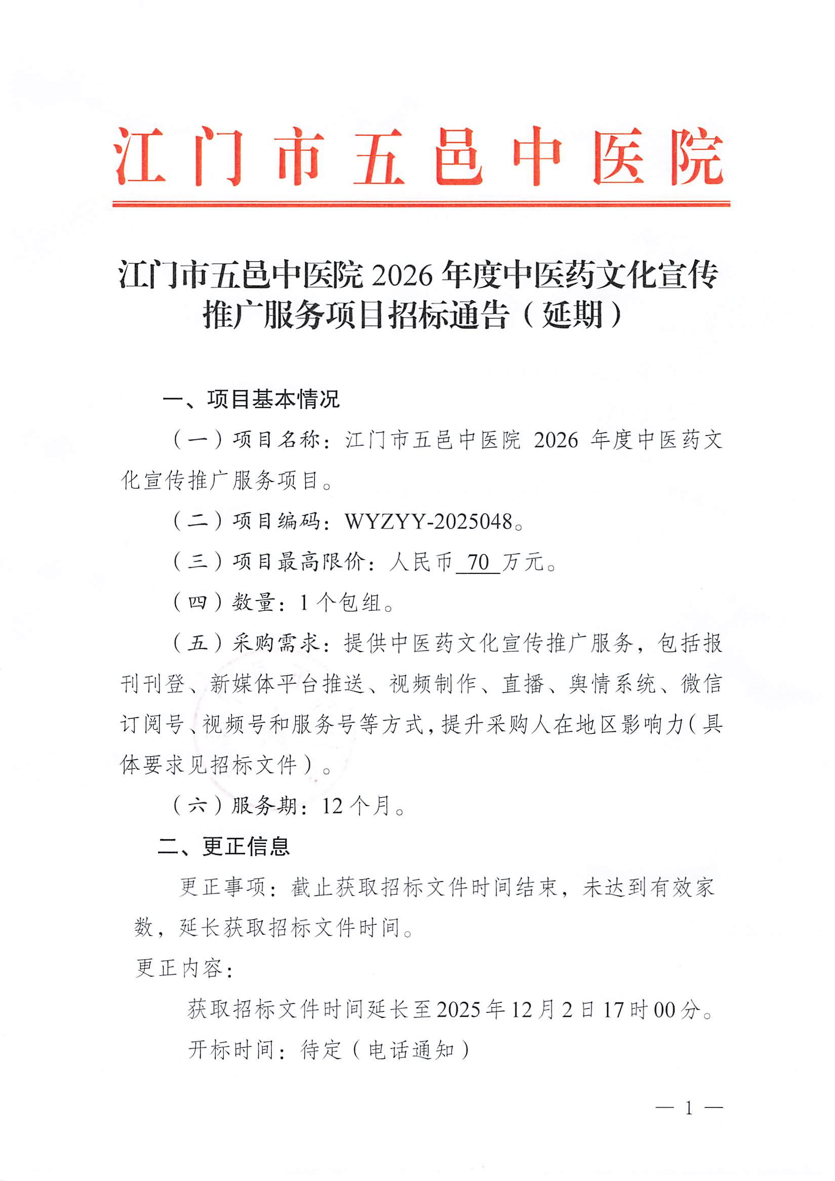 江门市五邑中医院2026年度中医药文化宣传推广服务项目招标通告(延期)