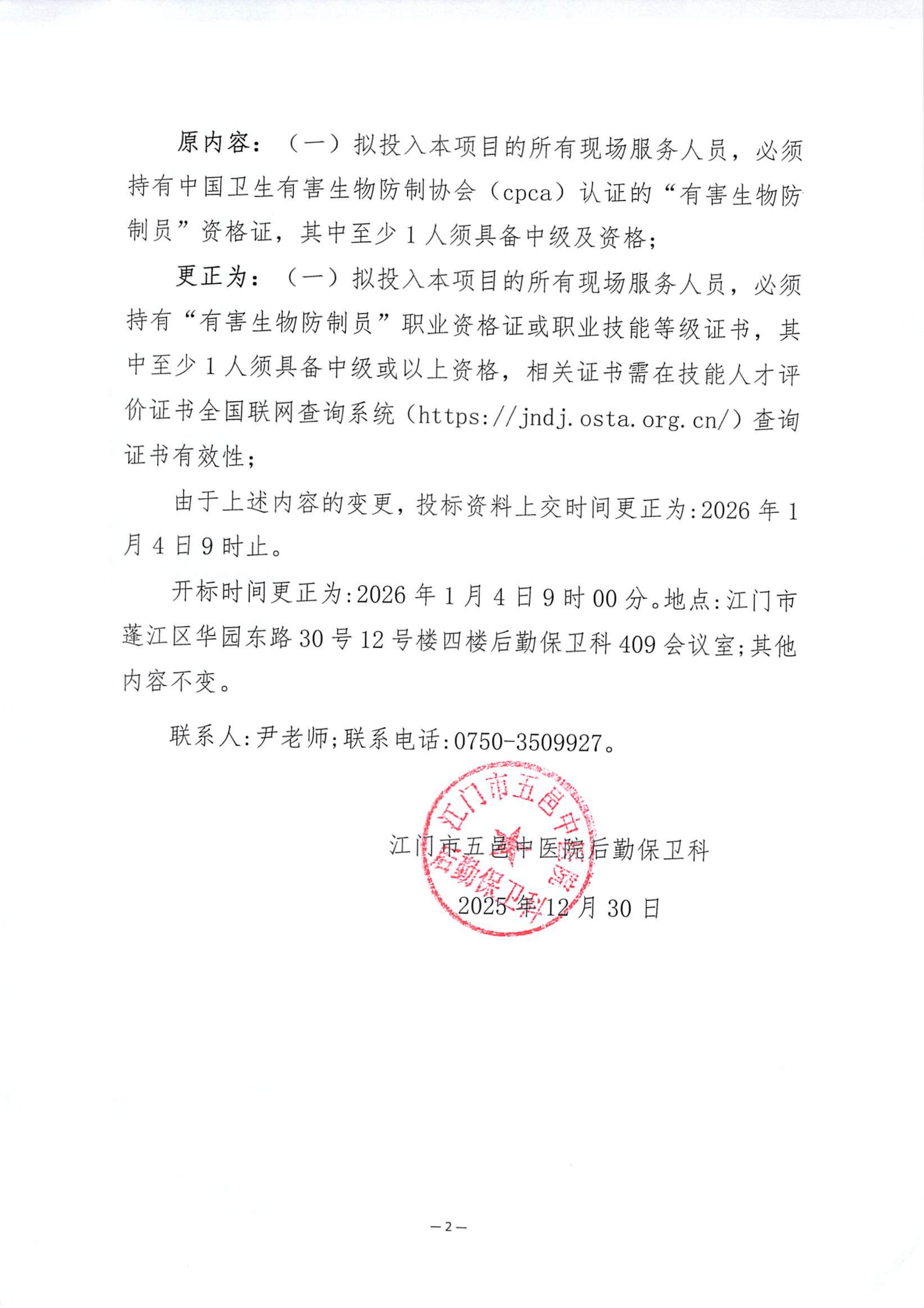 江门市五邑中医院2026-2027年度除四害及白蚁防治服务项目招标公告(更正)