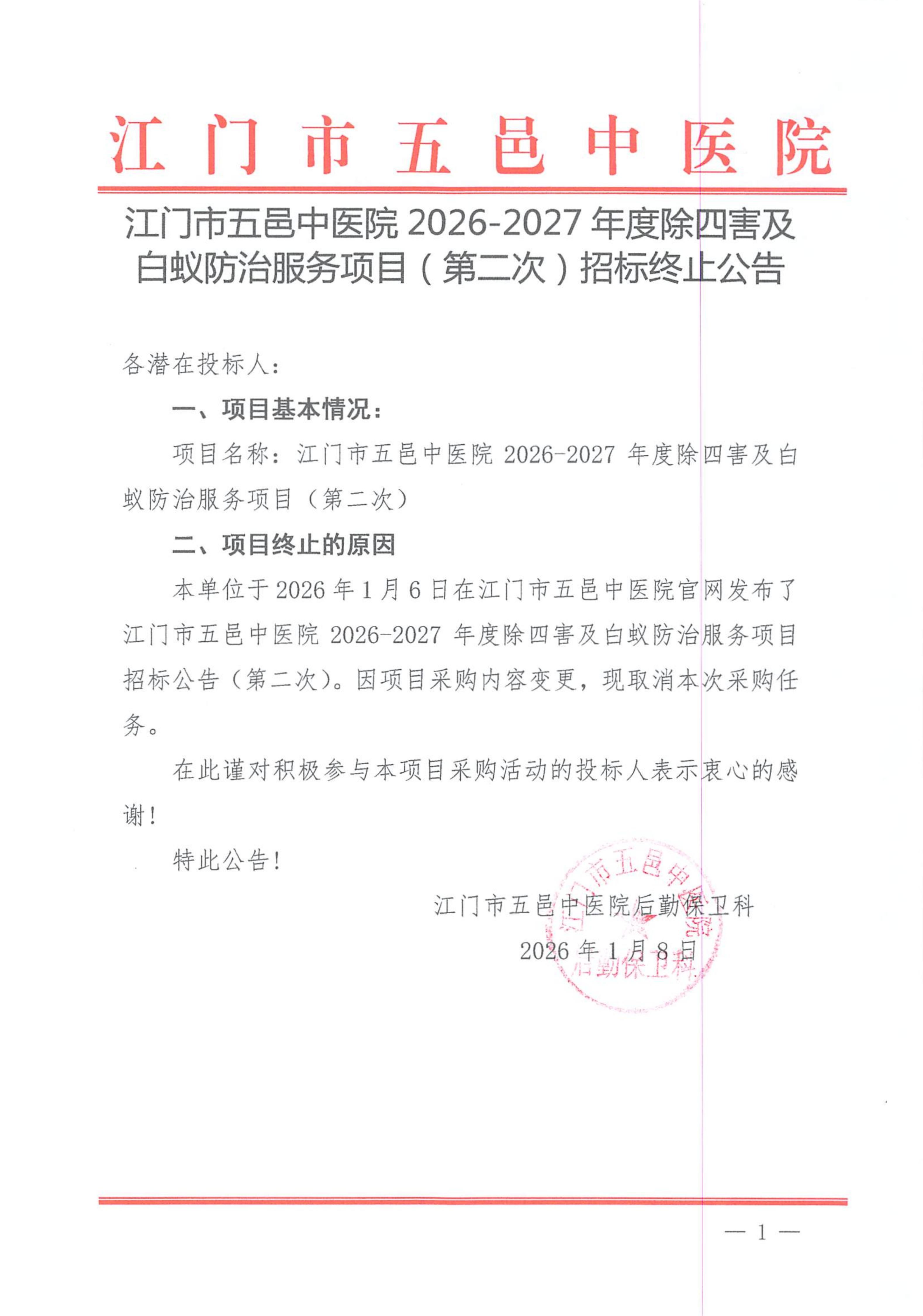 江门市五邑中医院2026-2027年度除四害及白蚁防治服务项目(第二次)招标终止公告