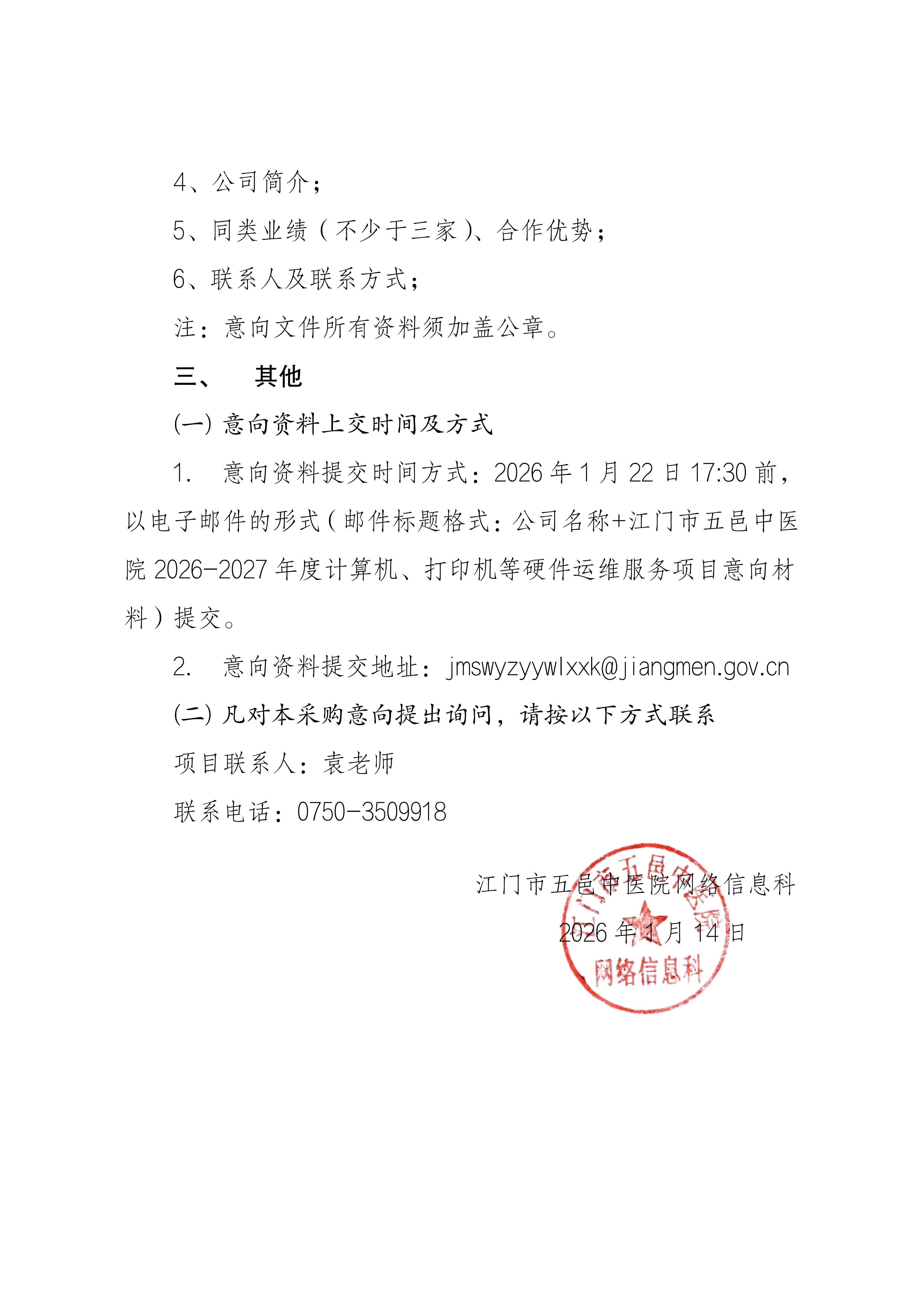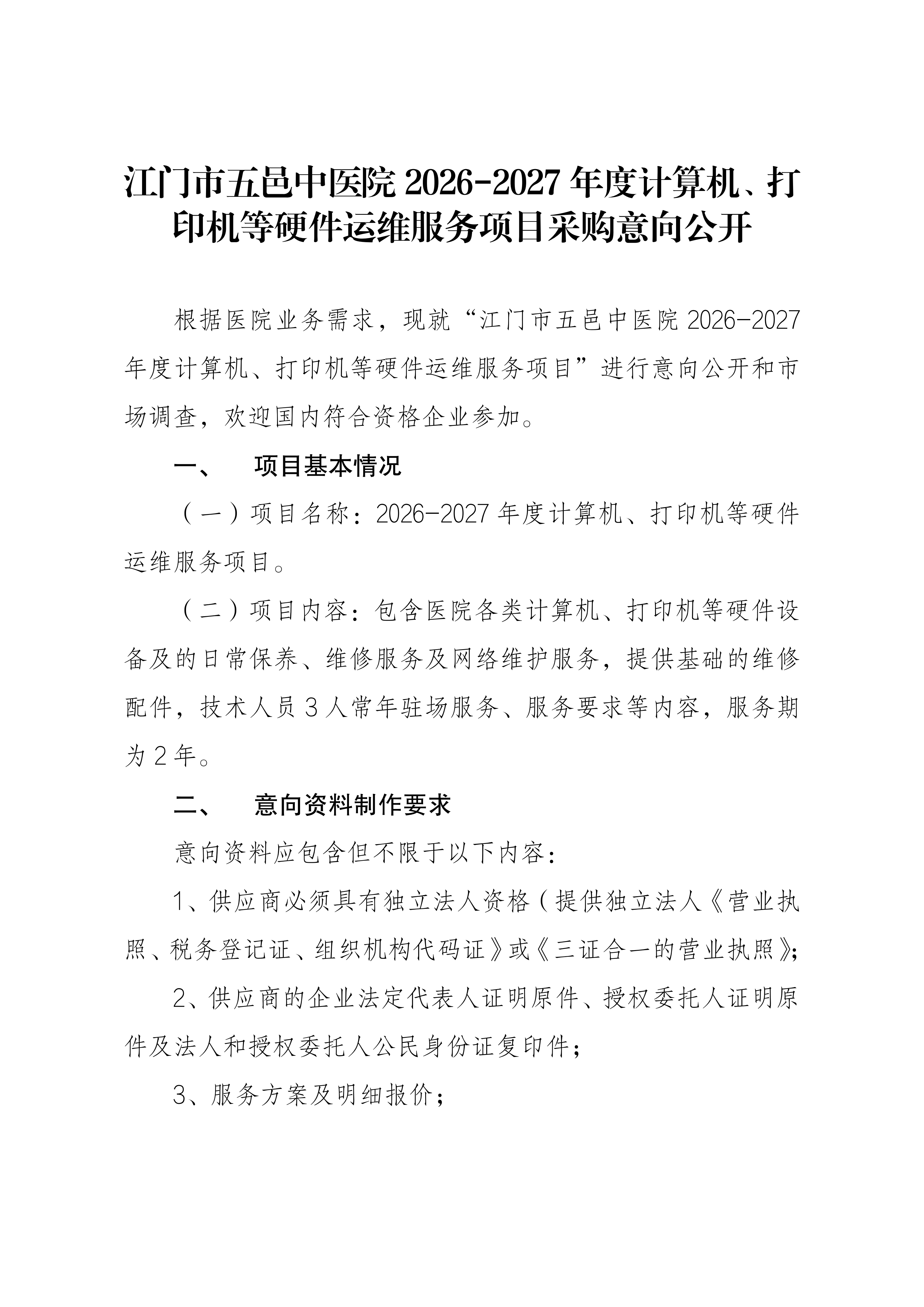 江门市五邑中医院2026-2027年度计算机、打印机等硬件运维服务项目采购意向公开