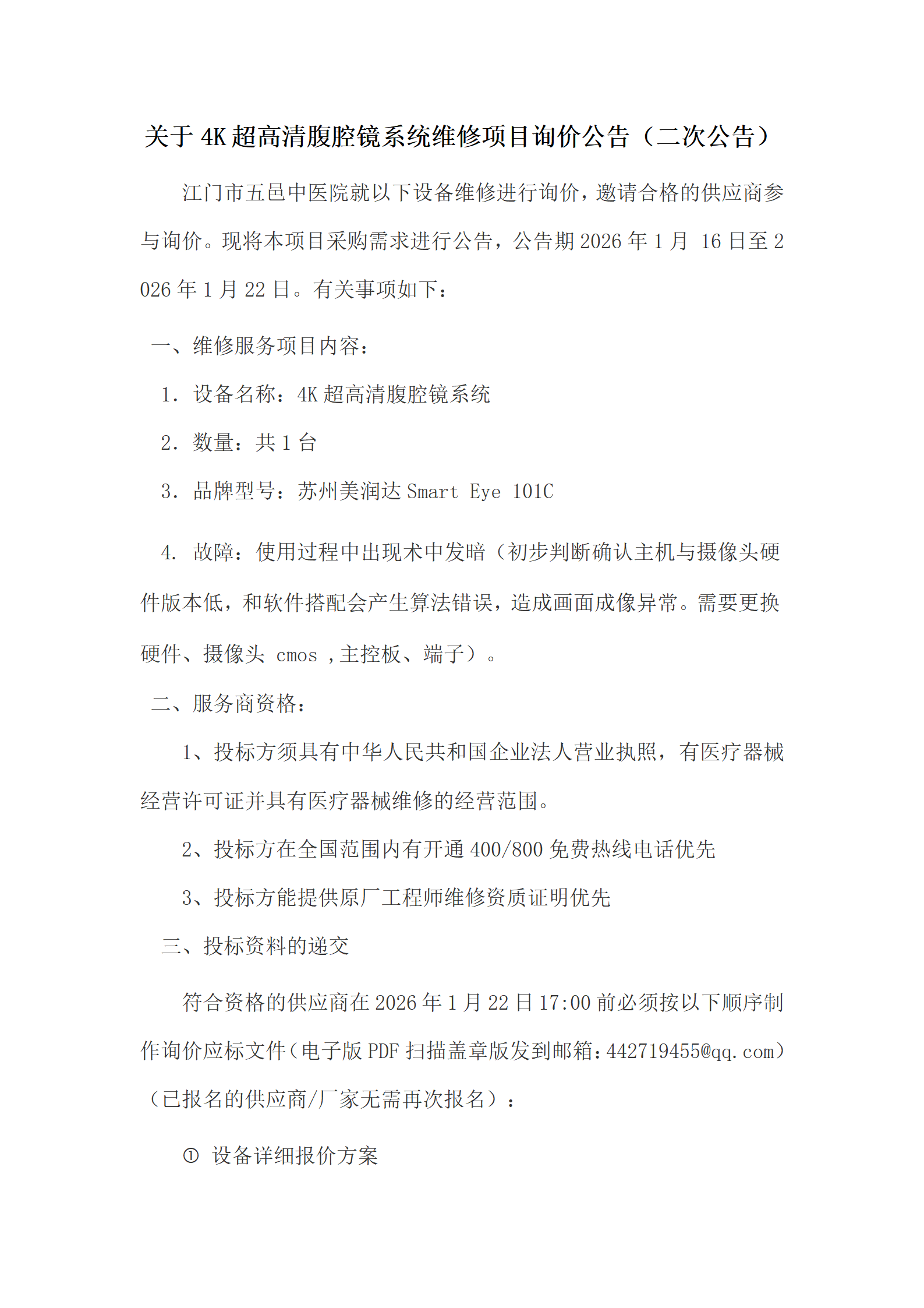 关于4K超高清腹腔镜系统维修项目询价公告(二次公告)