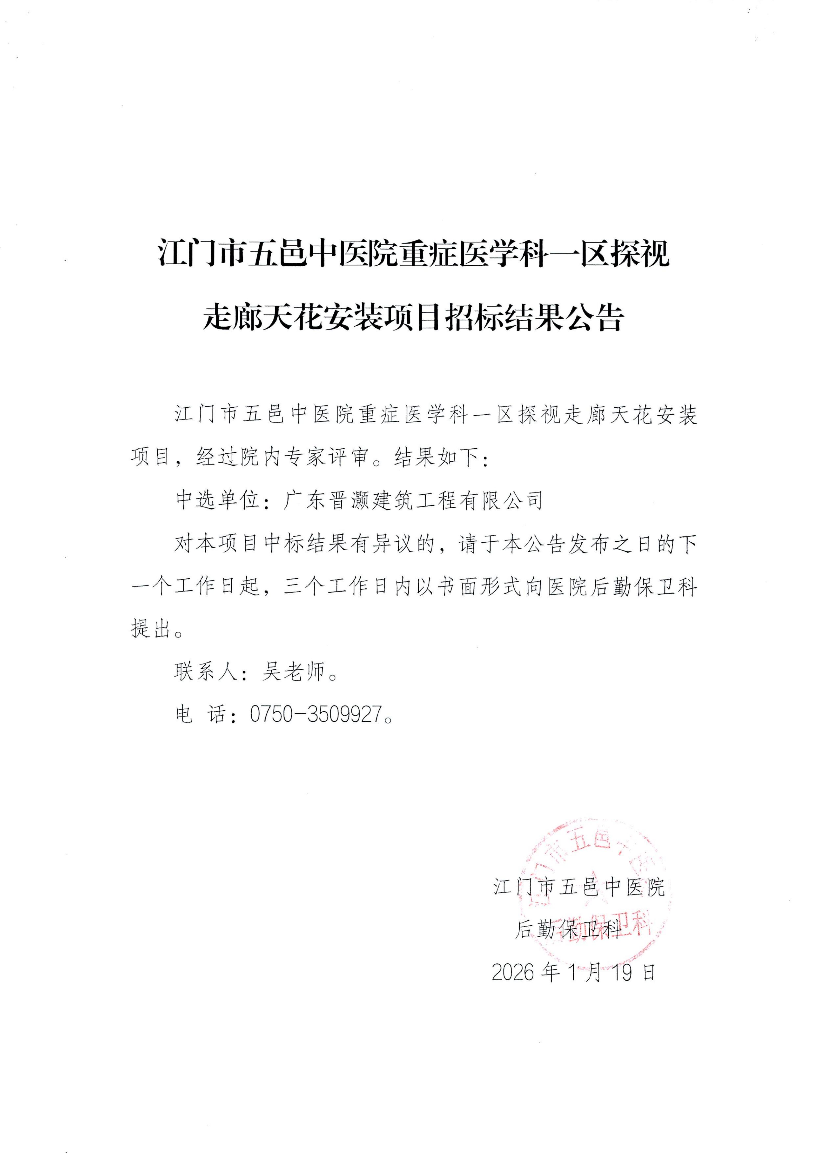江门市五邑中医院重症医学科一区探视走廊天花安装项目招标结果公告