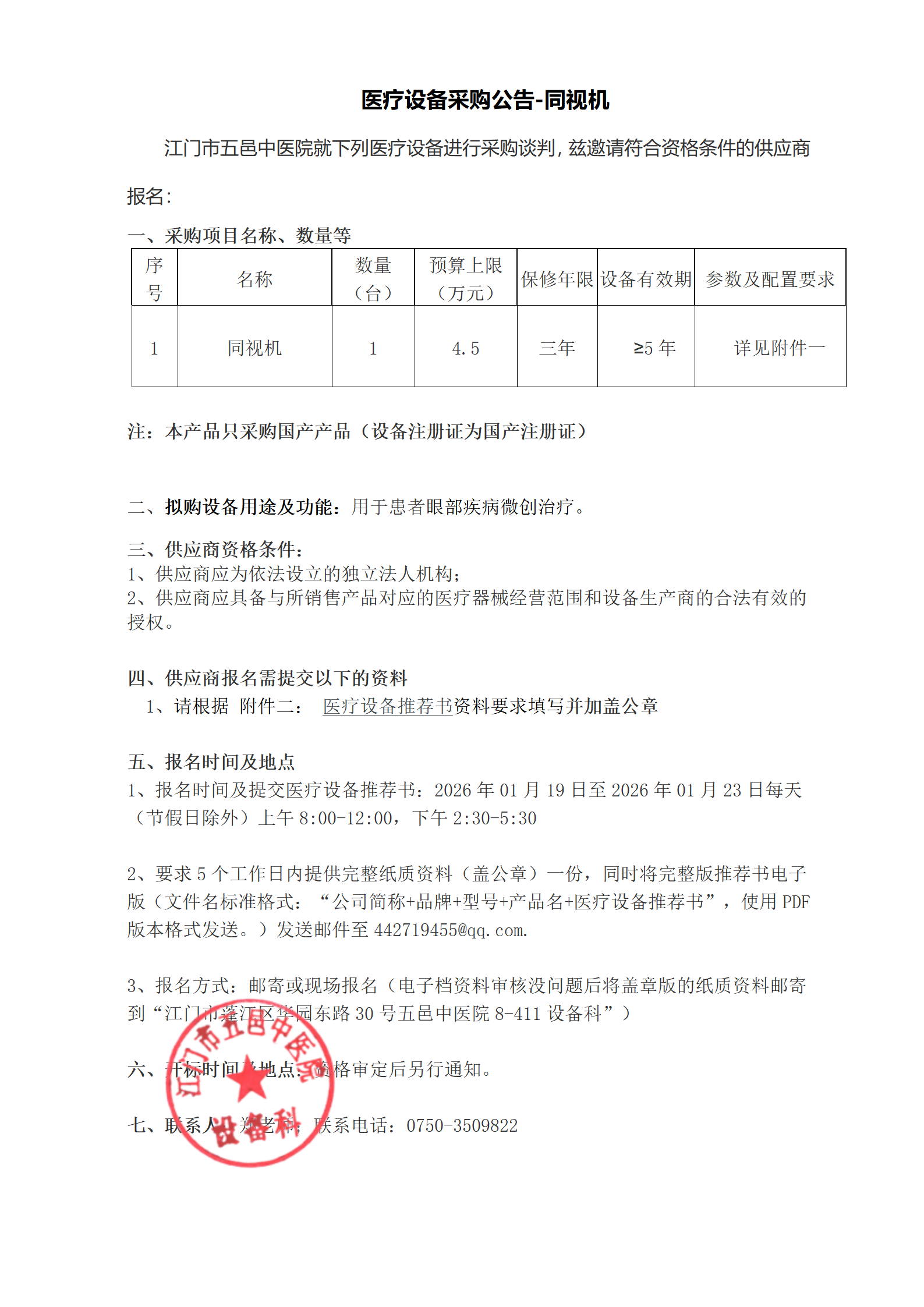 附件二五邑中医院医疗设备推荐书模板 .docx