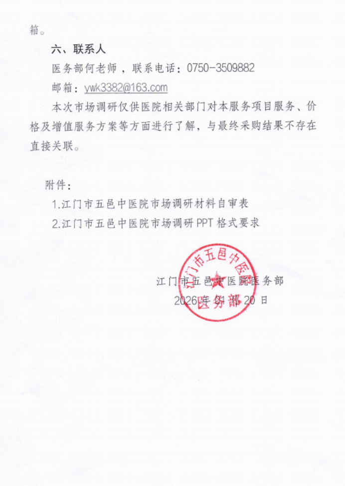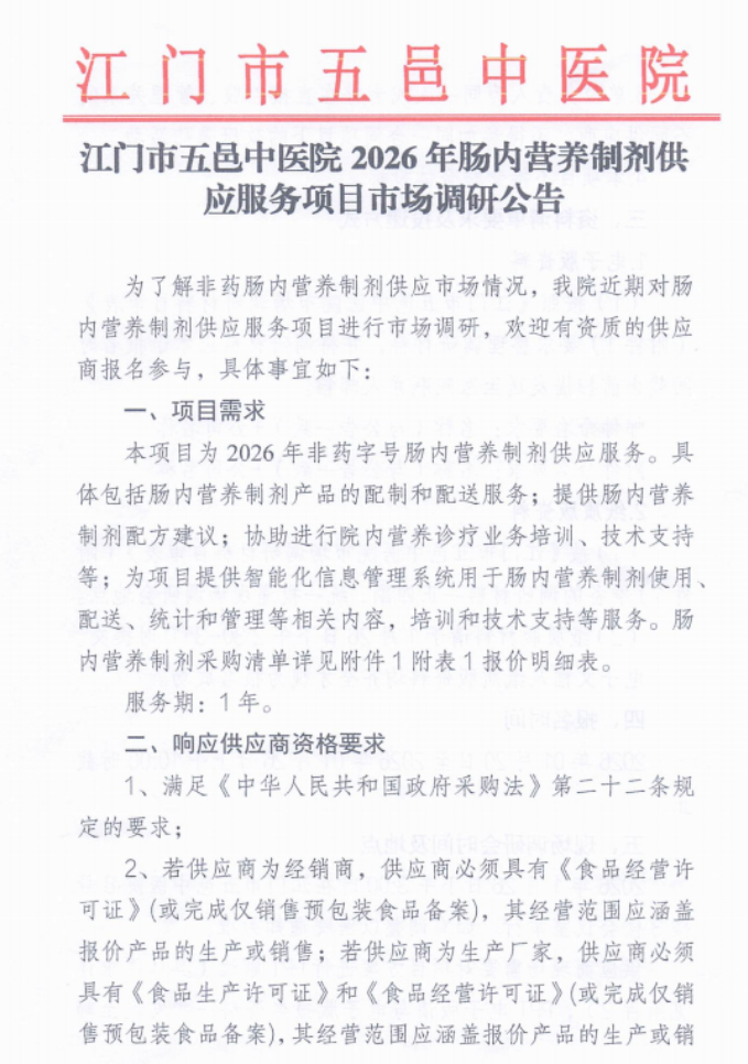 江门市五邑中医院2026年肠内营养制剂供应服务项目市场调研公告