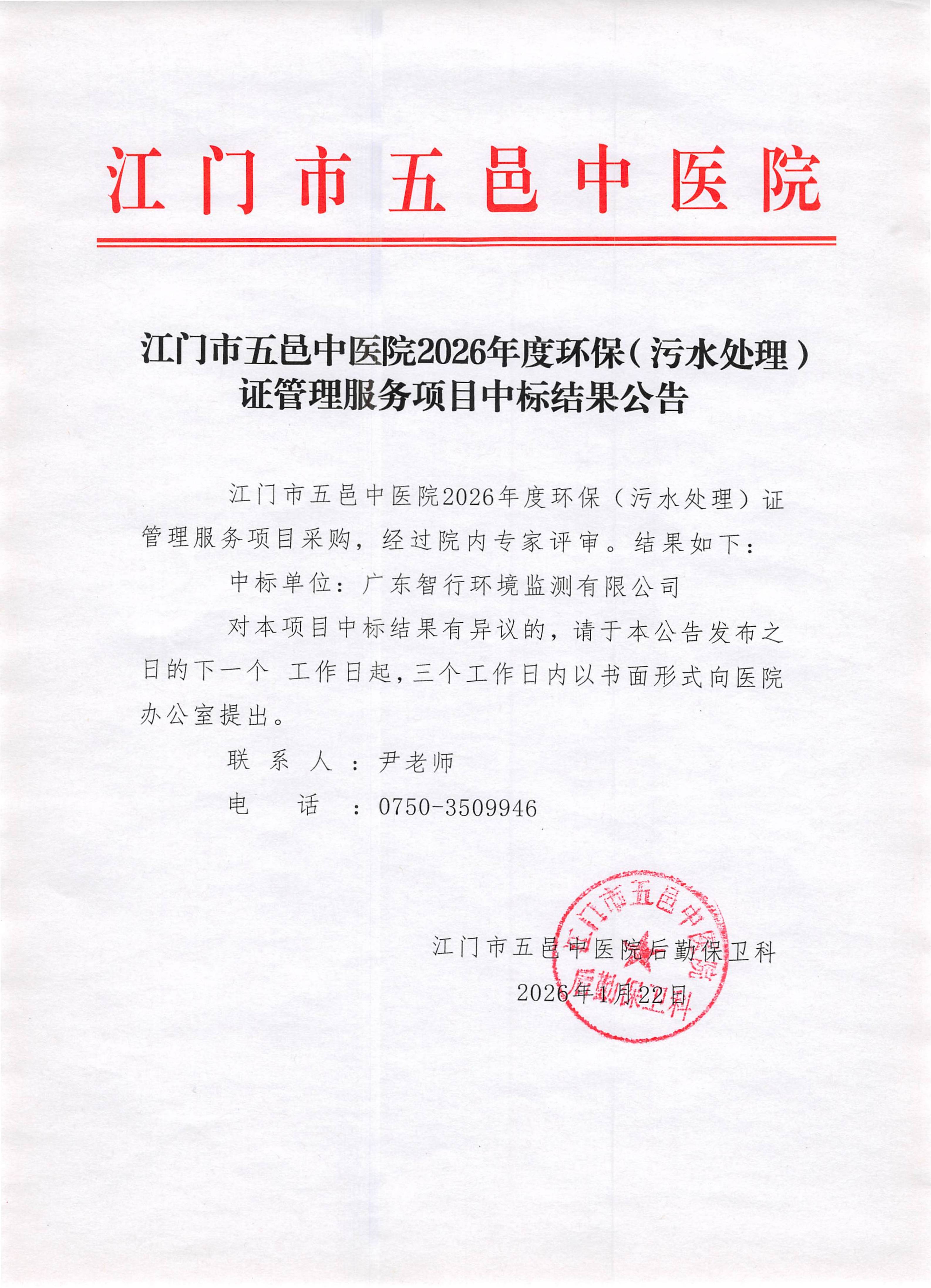 江门市五邑中医院2026年度环保(污水处理)证管理服务项目中标结果公告