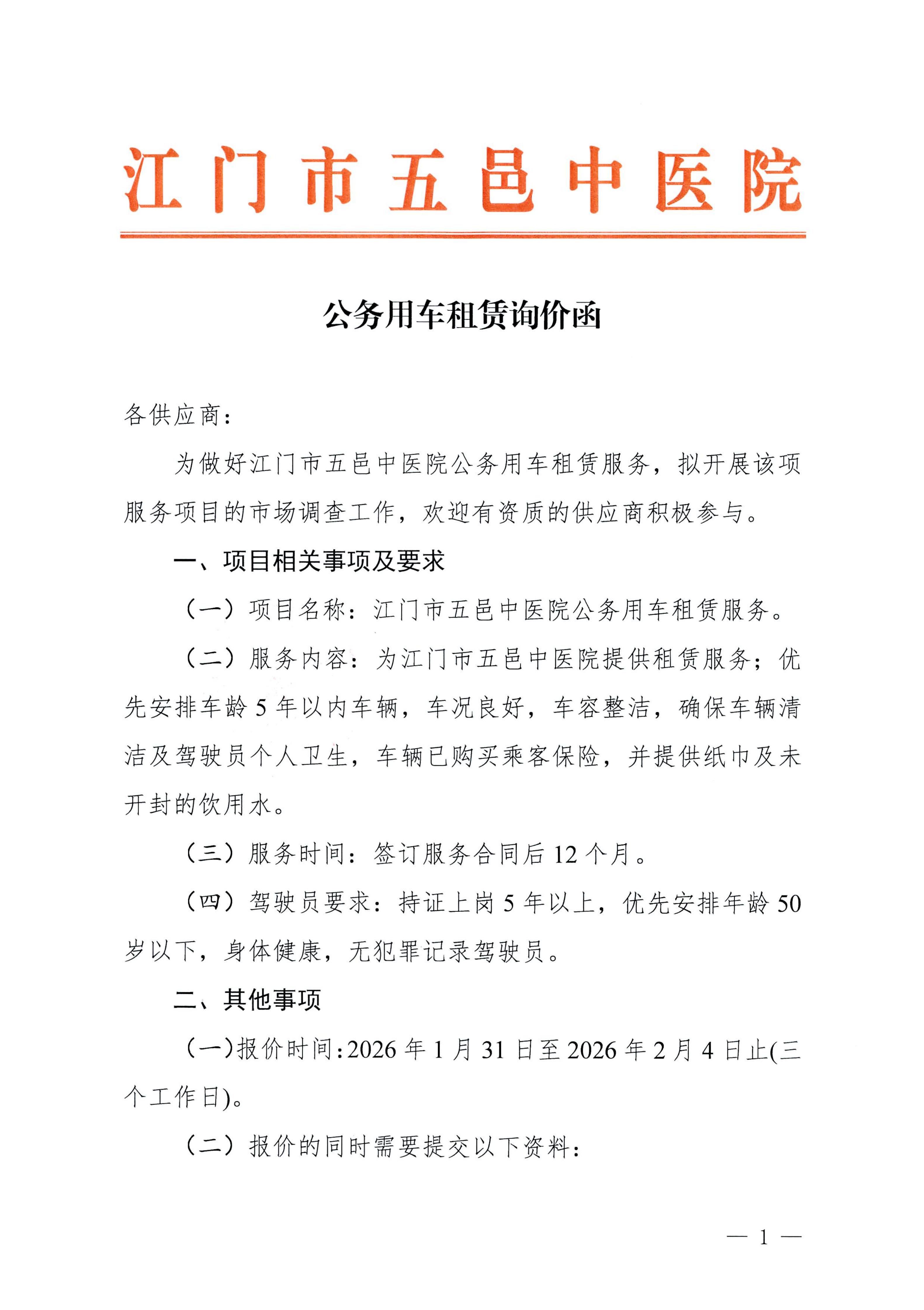 公务用车租赁询价函
