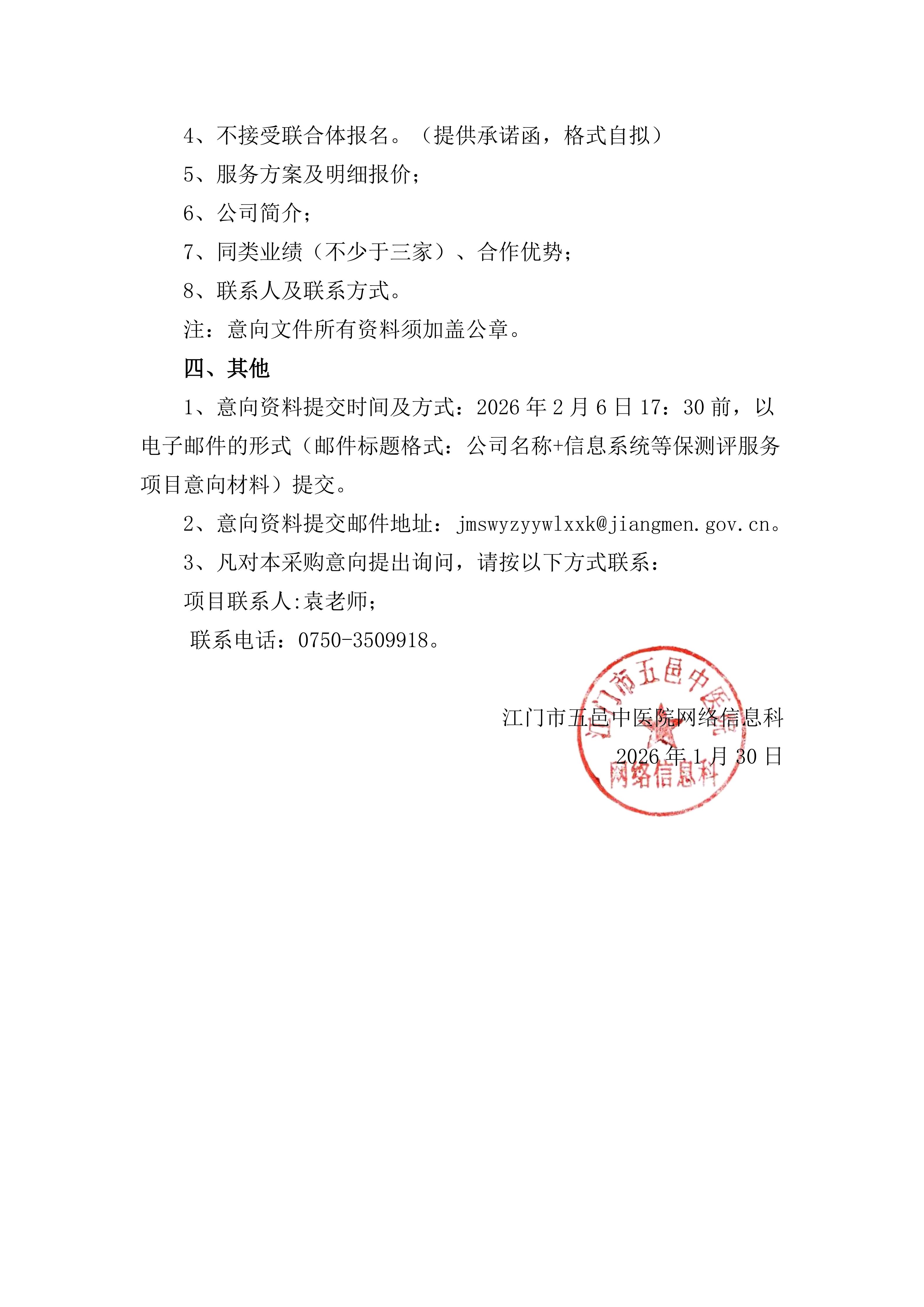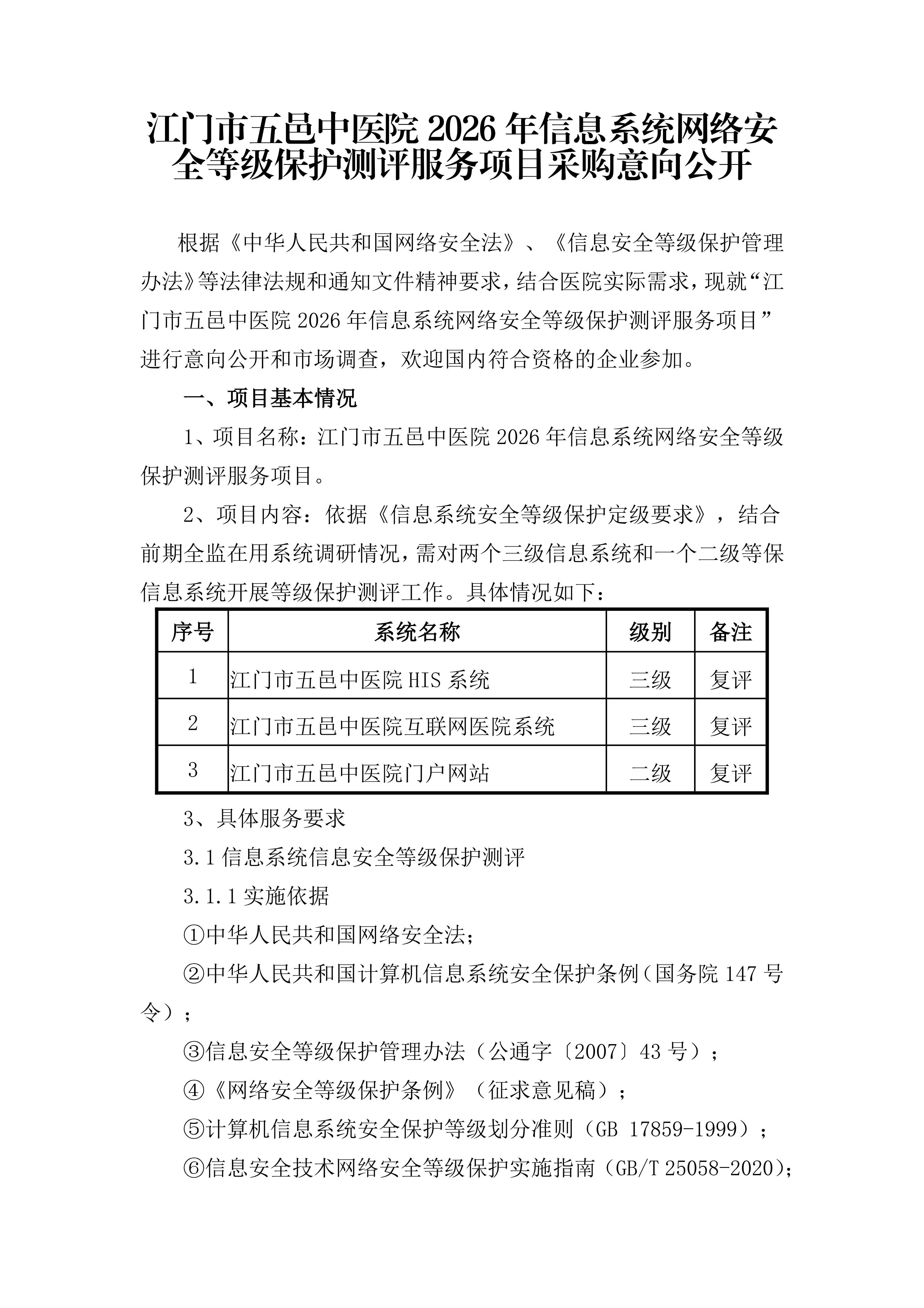 江门市五邑中医院2026年信息系统网络安全等级保护测评服务项目采购意向公开