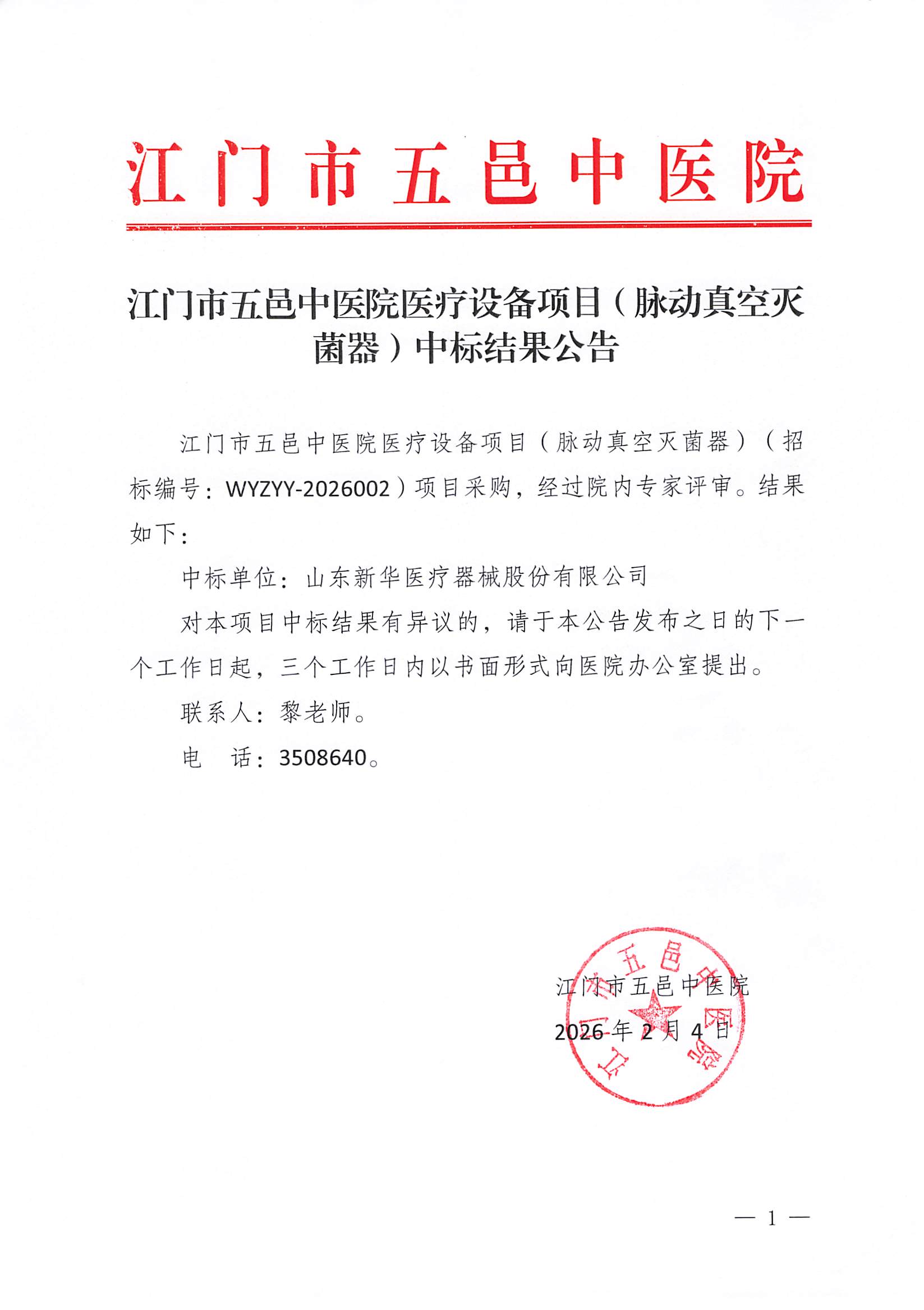 江门市五邑中医院医疗设备项目(脉动真空灭菌器)中标结果公告