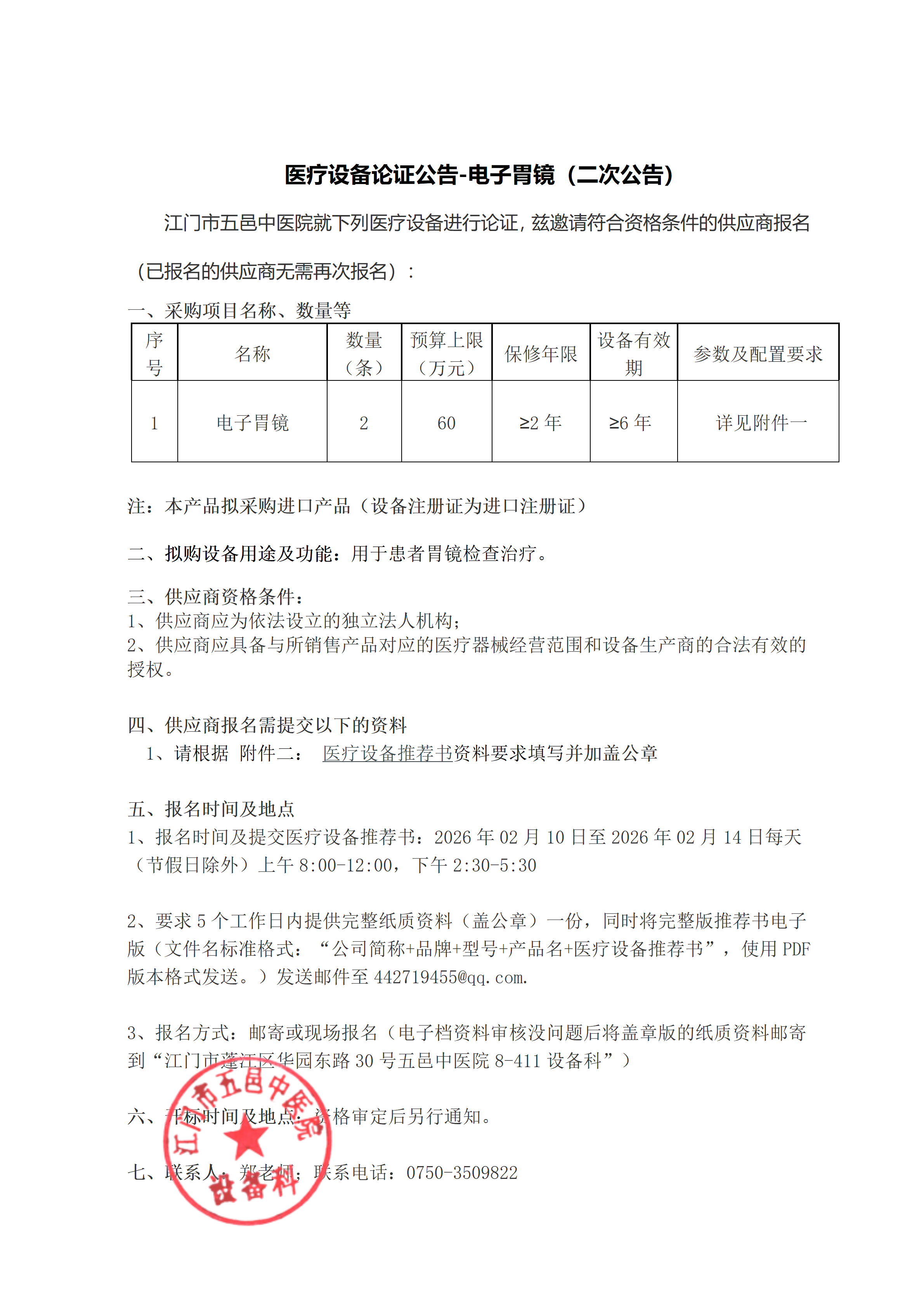 医疗设备论证公告-电子胃镜(二次公告)