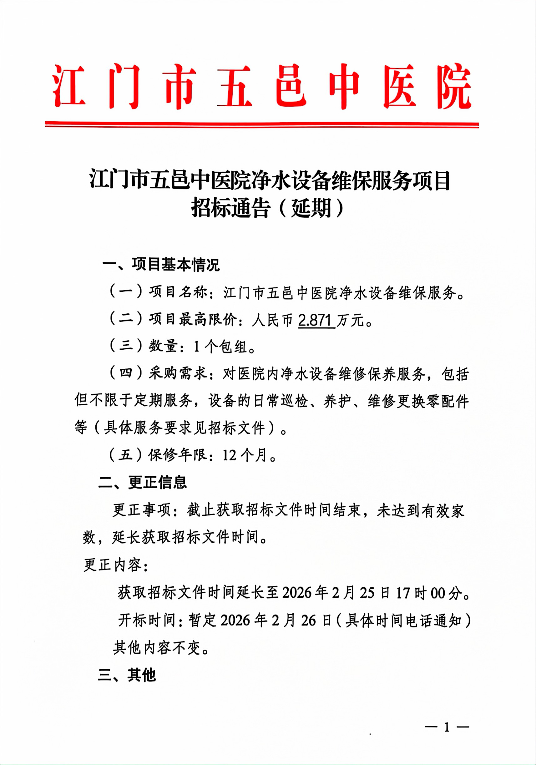 江门市五邑中医院净水设备维保服务项目招标通告(延期)
