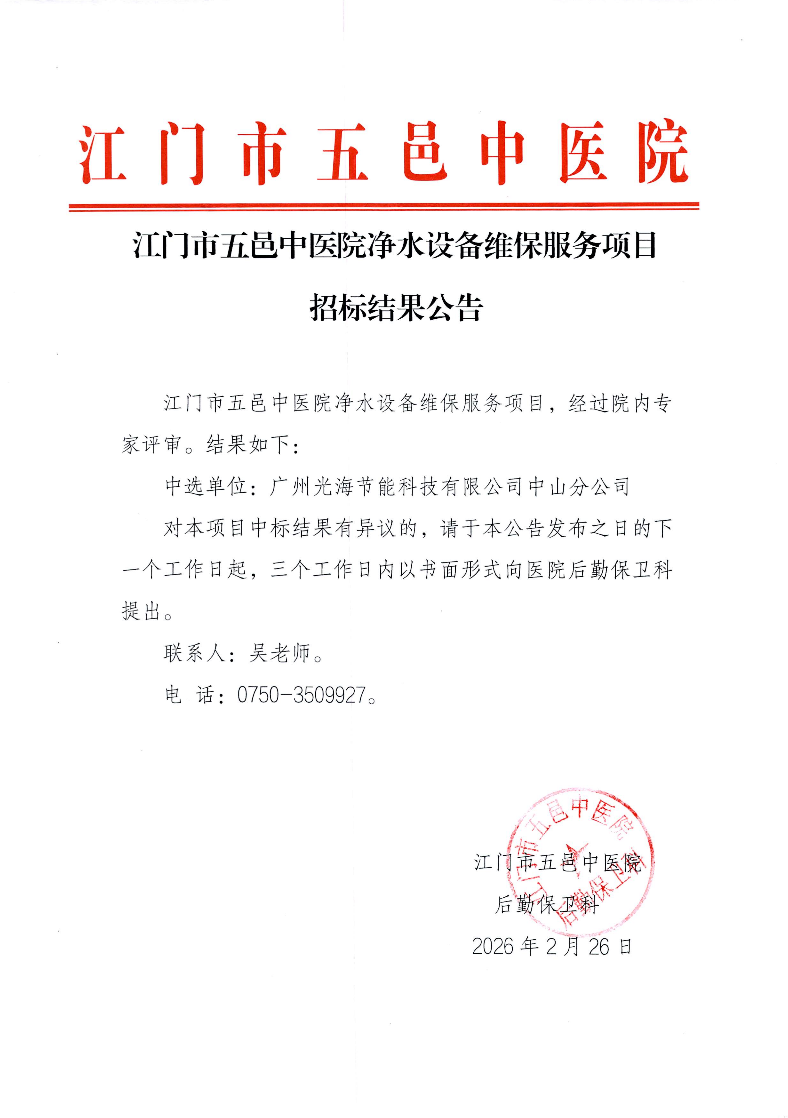 江门市五邑中医院净水设备维保服务项目招标结果公告