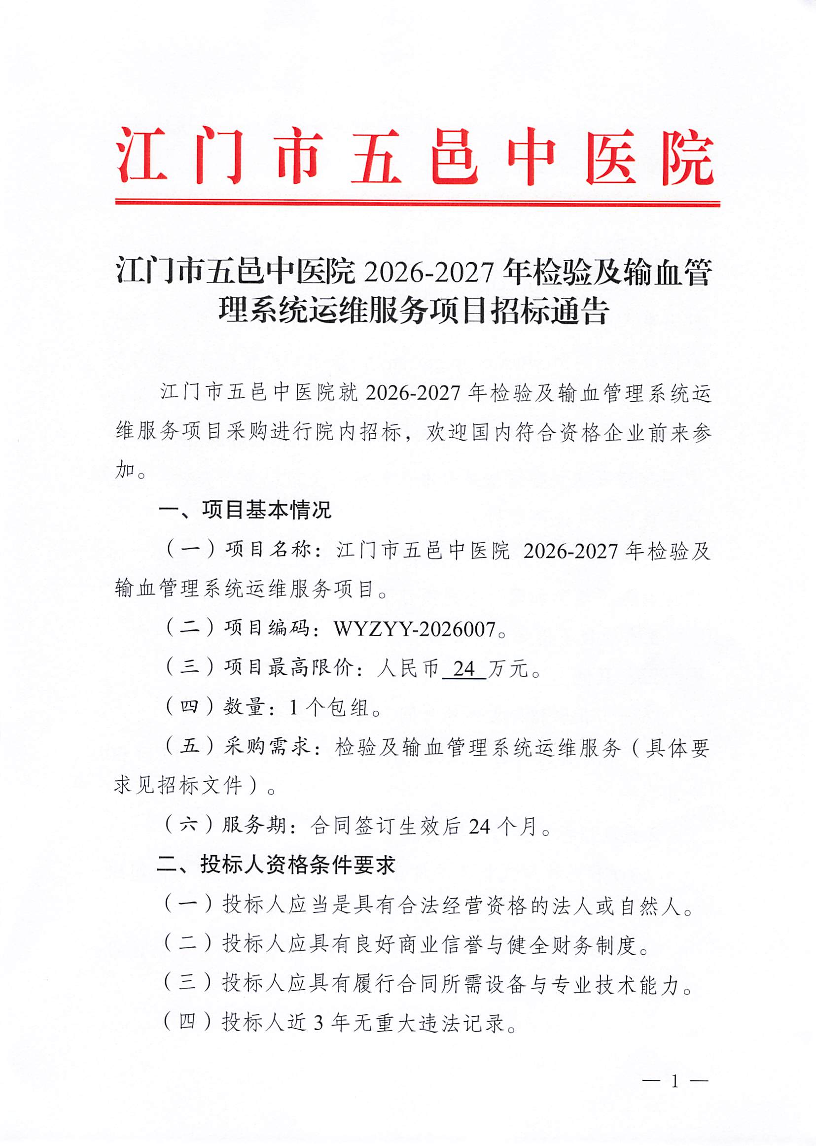 江门市五邑中医院2026-2027年检验及输血管理系统运维服务项目招标通告