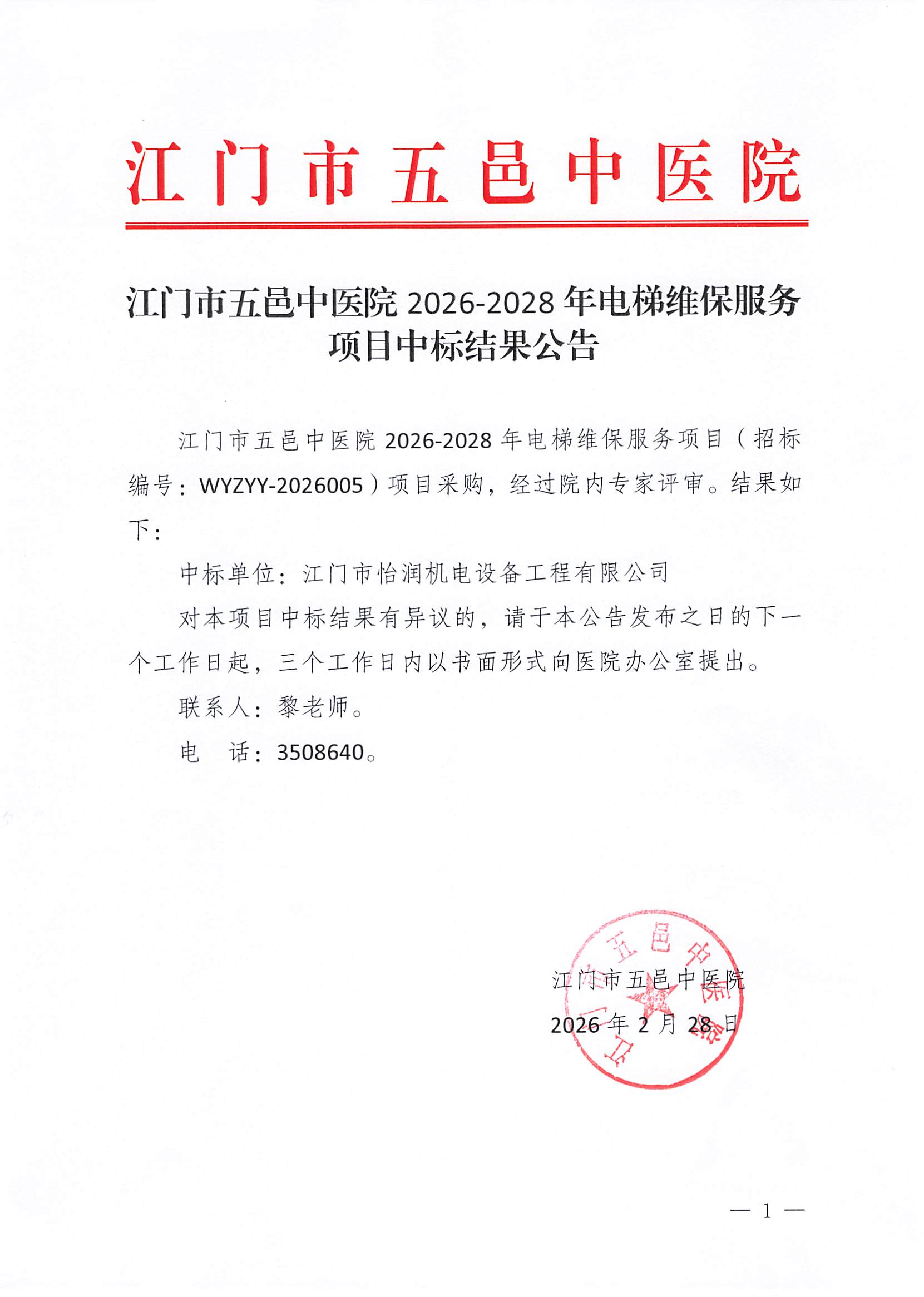 江门市五邑中医院2026-2028年电梯维保服务项目中标结果公告