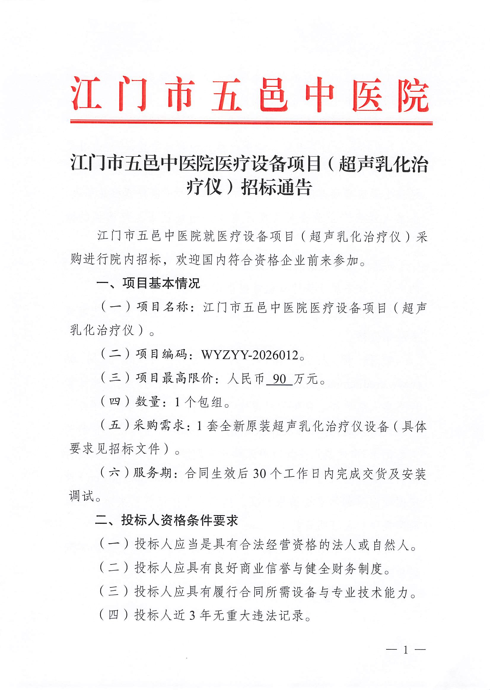 江门市五邑中医院医疗设备项目(超声乳化治疗仪)招标通告
